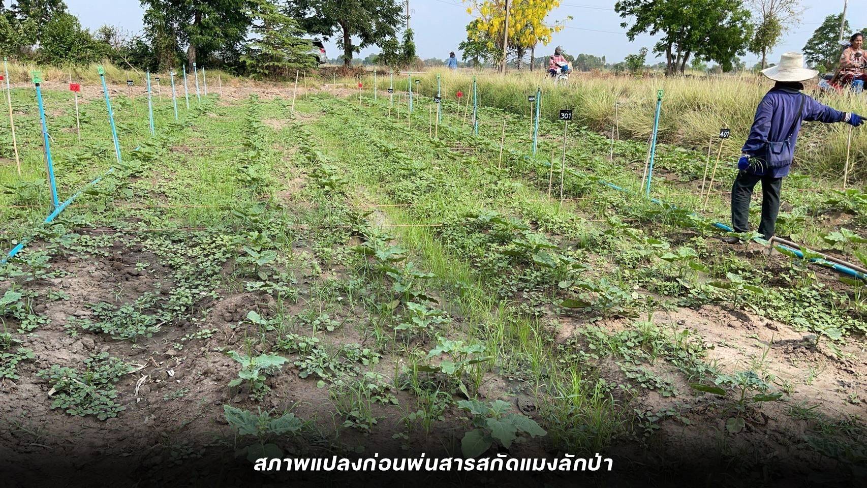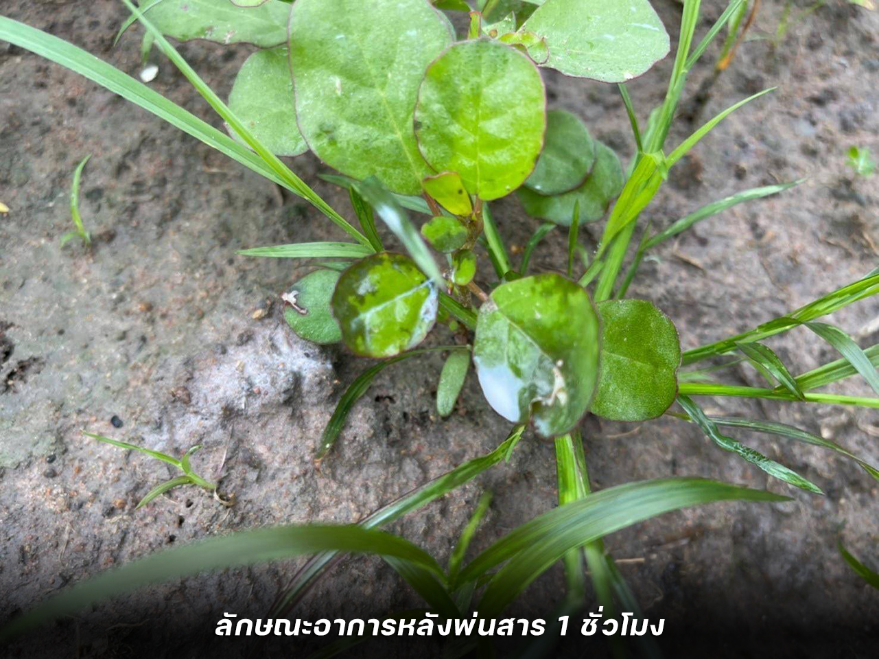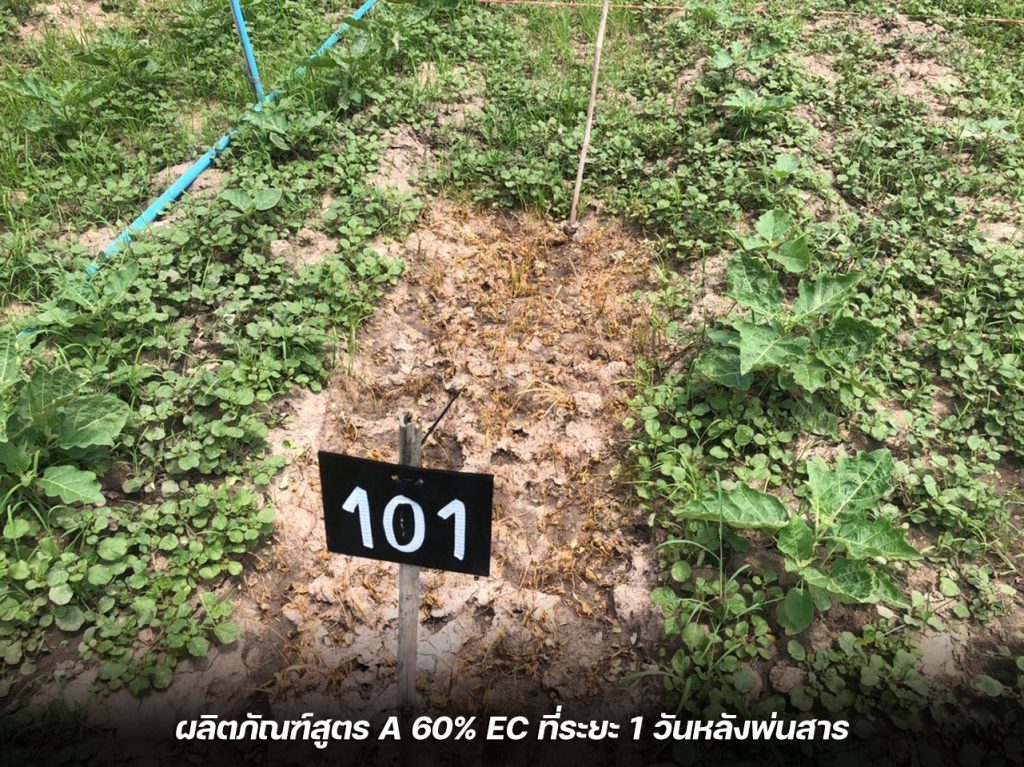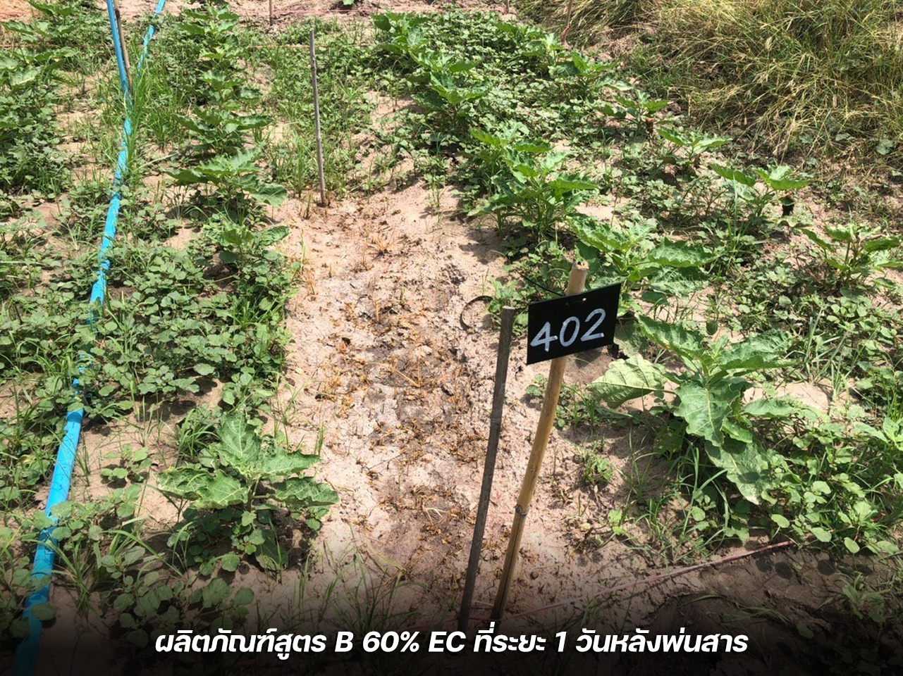 จากนั้นได้ดำเนินการทดสอบประสิทธิภาพในการกำจัดวัชพืชและทดสอบความเป็นพิษต่อพืชปลูกในสภาพไร่ ในแปลงปลูกมะเขือเปราะ โดยใช้พ่นระหว่างแถวปลูกมะเขือเปราะ อายุ 1 เดือนหลังย้ายกล้า และวัชพืชมีจำนวนใบ 3-5 ใบ หรือมีความสูงไม่เกิน 10 เซนติเมตร ซึ่งผลิตภัณฑ์ทั้ง 2 สูตร มีความเป็นพิษต่อมะเขือเปราะเล็กน้อย ทำให้เกิดจุดสีน้ำตาลที่ใบแต่ไม่มีผลกระทบต่อการเจริญเติบโต และมีประสิทธิภาพในการกำจัดวัชพืชประเภทใบกว้าง ได้แก่ ผักเบี้ยหิน วัชพืชประเภทใบแคบ ได้แก่ หญ้านกสีชมพู และวัชพืชประเภทกก ได้แก่ กกทราย ได้ดี ทำให้วัชพืชมีอาการตาย 90 – 100 เปอร์เซ็นต์