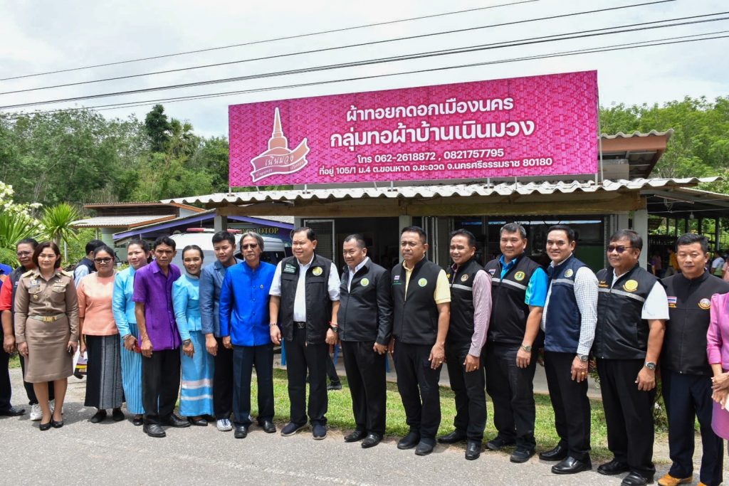 นอกจากนี้ คณะรัฐมนตรีช่วยว่าการกระทรวงเกษตรและสหกรณ์ ได้ลงพื้นที่เพื่อติดตามการทอผ้าไหมยกดอกเมืองนครของวิสาหกิจชุมชนบ้านเนินมวง ตำบลขอนหาด อำเภอชะอวด โดยมีนางมณฑา กันนิดา ประธานวิสาหกิจชุมชุนกลุ่มทอผ้าบ้านเนินมวง ให้การต้อนรับและนำเสนอการดำเนินงานของกลุ่มฯ ทั้งนี้ กรมหม่อนไหมได้ส่งเสริมการขอรับรองมาตรฐานผลิตภัณฑ์ผ้าไหมไทยตรานกยูงพระราชทาน ชนิดนกยูงสีเงิน หรือ Classic Thai Silk เพื่อเป็นการรับรองคุณภาพของผ้าไหมไทย สร้างความเชื่อมั่นให้กับผู้บริโภค