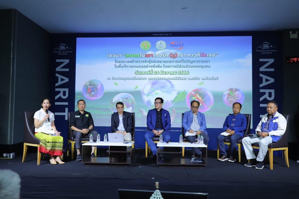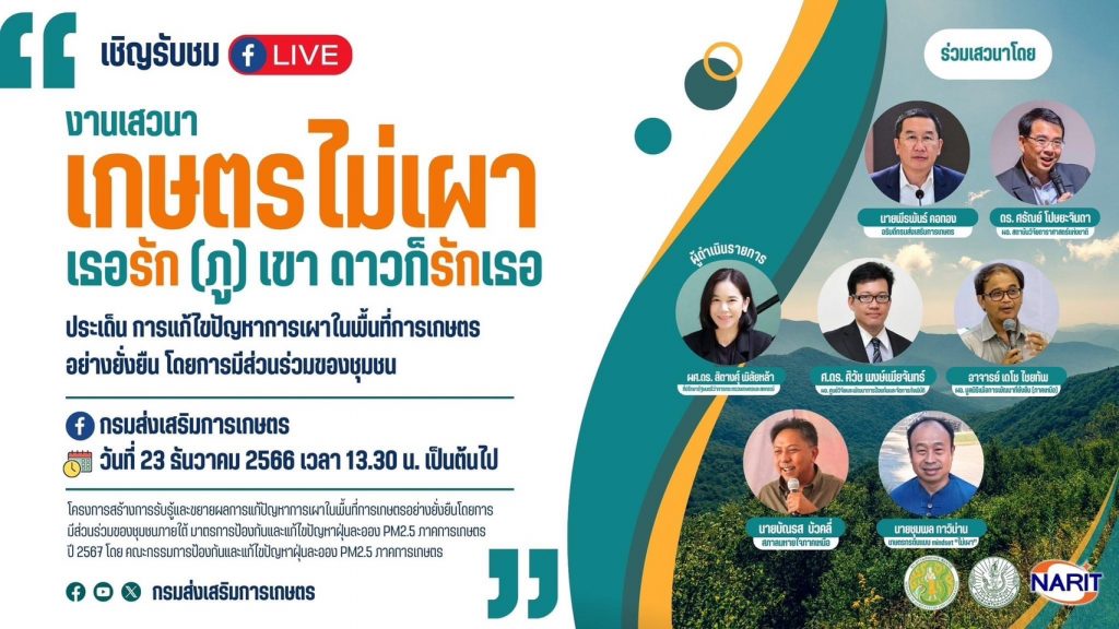 นอกจากนี้ เพื่อเป็นการสร้างการรับรู้และสร้างการมีส่วนร่วมของทุกภาคส่วนในการเสนอแนะแนวทางในการแก้ไขปัญหาการเผาในพื้นที่การเกษตรอย่างเป็นระบบ และตรงจุดมากขึ้น กรมส่งเสริมการเกษตร กระทรวงเกษตรและสหกรณ์ จึงได้กำหนดจัดการเสวนาวิชาการ เรื่อง “เกษตรไม่เผา เธอรัก (ภู) เขา ดาวก็รักเธอ” ภายใต้โครงการสร้างการรับรู้และขยายผลการแก้ไขปัญหาการเผาในพื้นที่การเกษตรอย่างยั่งยืน โดยการมีส่วนร่วมของชุมชน ซึ่งจัดขึ้น เมื่อวันที่ 23 ธันวาคม 2566 ณ อุทยานดาราศาสตร์สิรินธร อำเภอแม่ริม จังหวัดเชียงใหม่ โดยได้เชิญผู้ทรงคุณวุฒิ ผู้รู้ในด้านต่างๆ จากภาคราชการ ภาคประชาชน และภาคเกษตรกร มาร่วมเป็นวิทยากรนำเสนอมุมมองในการแก้ไขปัญหา