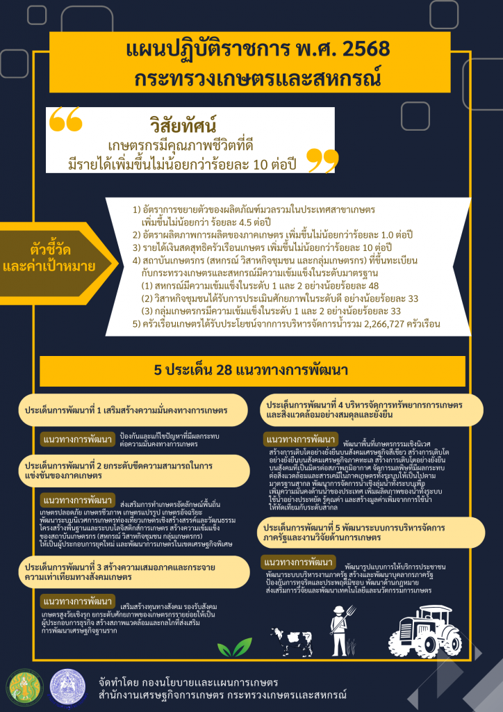 สำหรับแผนปฏิบัติราชการ พ.ศ. 2568 ของกระทรวงเกษตรและสหกรณ์ รัฐมนตรีว่าการกระทรวงเกษตรและสหกรณ์ ได้เห็นชอบแผนฯ เรียบร้อยแล้ว และประกาศใช้เมื่อวันที่ 13 ธันวาคม 2566 โดยแผนฯ ดังกล่าว กำหนดวิสัยทัศน์ คือ “เกษตรกรมีคุณภาพชีวิตที่ดี มีรายได้เพิ่มขึ้นไม่น้อยกว่าร้อยละ 10 ต่อปี” โดยมีประเด็นการพัฒนา 5 ประเด็น ได้แก่ 1) เสริมสร้างความมั่นคงทางการเกษตร ซึ่งมุ่งเน้นการป้องกันและแก้ปัญหาที่มีผลกระทบต่อความมั่นคงด้านอาหาร 2) ยกระดับขีดความสามารถในการแข่งขันของภาคเกษตร เน้นการเกษตรมูลค่าสูง พัฒนาโครงสร้างพื้นฐานทางการเกษตร สร้างความเข้มแข็งให้สถาบันเกษตรกร และพัฒนาการเกษตรในเขตเศรษฐกิจพิเศษ 3) สร้างความเสมอภาคและกระจายความเท่าเทียมทางสังคมเกษตร โดยเสริมสร้างทุนทางสังคม รองรับสังคมเกษตรสูงวัย ยกระดับผู้ประกอบการธุรกิจเกษตร และพัฒนาเศรษฐกิจฐานราก 4) บริหารจัดการทรัพยากรการเกษตรและสิ่งแวดล้อมอย่างสมดุลและยั่งยืน โดยการสร้างการเติบโตบนสังคมเศรษฐกิจสีเขียว และการบริหารจัดการน้ำทั้งระบบ และ 5) พัฒนาระบบการบริหารจัดการภาครัฐและงานวิจัยด้านการเกษตร เน้นการพัฒนารูปแบบการให้บริการประชาชน พัฒนาบุคลากร และส่งเสริมการวิจัย พัฒนาและประยุกต์ใช้เทคโนโลยีและนวัตกรรมในภาคการเกษตร ซึ่งกรอบงบประมาณปี 2568 ตามนโยบายสำคัญของนายกรัฐมนตรี 142 ประเด็นสำคัญ และมีความเกี่ยวข้องกับกระทรวงเกษตรฯ 26 ประเด็น โดยกระทรวงเกษตรฯ เน้นการสร้างรายได้ให้แก่เกษตรกรโดยการส่งเสริมนวัตกรรมเกษตรแม่นยำ สนับสนุนการปลูกพืชให้เหมาะสมกับสิ่งแวดล้อมและเศรษฐกิจ และเปิดตลาดสินค้าเกษตรใหม่ ๆ การลดรายจ่ายโดยมุ่งแก้ปัญหาหนี้สินเกษตรกร และขยายโอกาสโดยการวางแผนรับมือและป้องกันวิกฤตด้านสิ่งแวดล้อมและการดูแลรักษาทรัพยากรธรรมชาติ