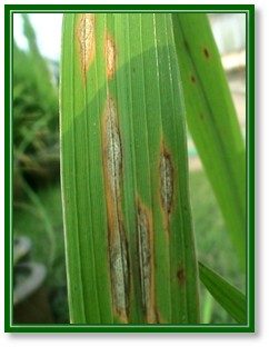 ทําลายระยะกล้าถึงออกรวง ใบเป็นจุดสีน้ำตาลคล้ายรูปตา หัวท้ายแหลม ตรงกลาง แผลมีจุดสีเทา กรณีที่โรคระบาดรุนแรงแผลขยายติดกัน กล้าข้าวจะแห้งฟุบตายทั้งกอ อาการคล้ายถูกไฟไหม้ ระยะแตกกอ อาการของโรคพบได้ที่กาบใบ ข้อต่อใบและข้อต่อ ของลำต้น ระยะออกรวง มีแผลที่คอรวง เกิดเมล็ดลีบ ถ้าข้าวเริ่มโน้มรวงเกิดแผลช้ำที่คอรวง ทําให้รวงหัก