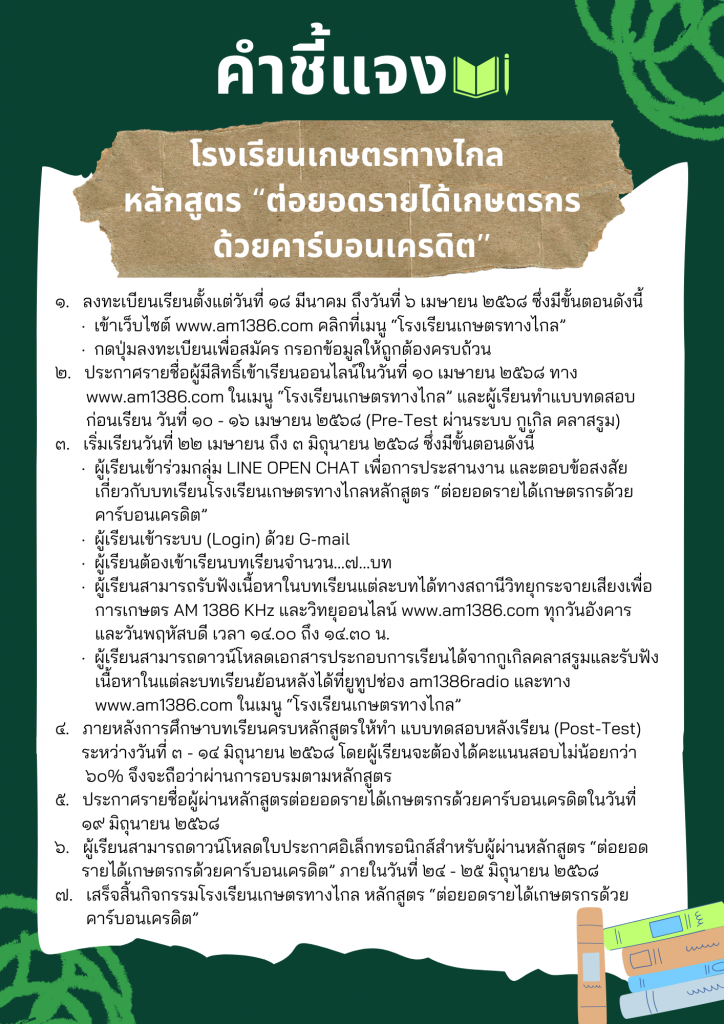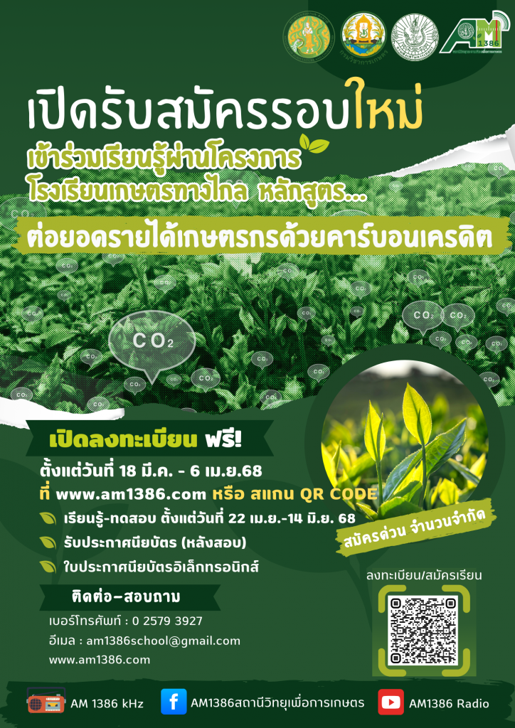 โรงเรียนเกษตรทางไกล_คาร์บอนเครดิต ปี2568 สอบถามรายละเอียดเพิ่มเติม : สถานีวิทยุกระจายเสียงเพื่อการเกษตร โทร 0 2579 3927