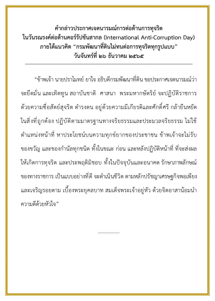 วันจันทร์ที่ 26 ธันวาคม 2565 เวลา 09.00 น. นายปราโมทย์ ยาใจ อธิบดีกรมพัฒนาที่ดิน เป็นประธานกิจกรรมรณรงค์เนื่องในวันต่อต้านคอร์รัปชันสากล (International Anti-Corruption Day) ภายใต้แนวคิด “กรมพัฒนาที่ดิน ไม่ทนต่อการทุจริตทุกรูปแบบ” ณ บริเวณสนามหญ้า กรมพัฒนาที่ดิน โดยมีรองอธิบดีกรมพัฒนาที่ดิน ผู้อำนวยการกอง/สำนัก ผู้เชี่ยวชาญ และผู้อำนวยการกลุ่ม/ฝ่าย ร่วมประกาศเจตนารมณ์ และแสดงออกเชิงสัญลักษณ์ในการต่อต้านการทุจริต สร้างสังคมที่ไม่ยอม ไม่ทน และไม่เพิกเฉยต่อการทุจริตคอร์รัปชันทุกรูปแบบ เป็นการขับเคลื่อนยุทธศาสตร์ชาติว่าด้วยการป้องกันและปราบปรามการทุจริต แสดงถึงเจตนารมณ์ร่วมกันของผู้บริหารทุกระดับในการมีส่วนร่วมรณรงค์ป้องกันและต่อต้านการทุจริต และปฏิบัติตามนโยบาย No Gift Policy ของกรมพัฒนาที่ดิน