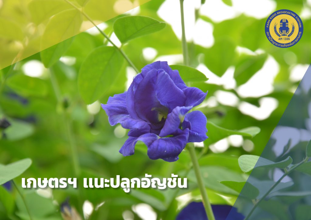 อัญชันเป็นพืชที่กรมส่งเสริมการเกษตรแนะนำให้เกษตรกรปลูกในช่วงฤดูแล้ง ทดแทนการทำนาปรัง ใช้น้ำน้อย ดูแลรักษาง่าย ใช้พื้นที่น้อย การขยายพันธุ์และการดูแลรักษาที่ไม่ยุ่งยาก มากสรรพคุณ เพิ่มการไหลเวียนเลือด บำรุงรากผม