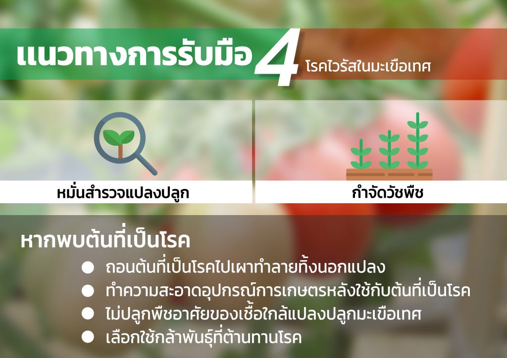 ในพื้นที่ที่พบการระบาดของทั้ง 4 โรคนี้ ให้เกษตรกรหมั่นตรวจและกำจัดวัชพืชในแปลงและรอบแปลงปลูกอย่างสม่ำเสมอ เพื่อลดแหล่งสะสมเชื้อไวรัสและแมลงพาหะ ถ้าพบต้นที่เป็นโรคให้ถอนแล้วนำไปเผาทำลายนอกแปลงปลูกทันที ควรทำความสะอาดอุปกรณ์การเกษตรเมื่อใช้กับต้นที่เป็นโรคก่อนนำกลับมาใช้ใหม่ หลังเก็บเกี่ยวผลผลิตเรียบร้อยแล้ว ให้เก็บเศษซากพืชส่วนที่หลงเหลือในแปลงไปเผาทำลายนอกแปลงปลูก หากพบโรคในแปลงที่จะปลูกฤดูถัดไป ไม่ควรปลูกพืชอาศัยของเชื้อใกล้แปลงปลูกมะเขือเทศ เช่น ขึ้นฉ่าย ยาสูบ งา กะเพราขาว ตำลึง หงอนไก่ บานไม่รู้โรย ทานตะวัน พืชตระกูลแตง พืชตระกูลถั่ว และพืชตระกูลมะเขือ อีกทั้งควรเลือกใช้กล้าพันธุ์มะเขือเทศที่ต้านทานโรค แข็งแรง และปลอดโรคมาปลูก