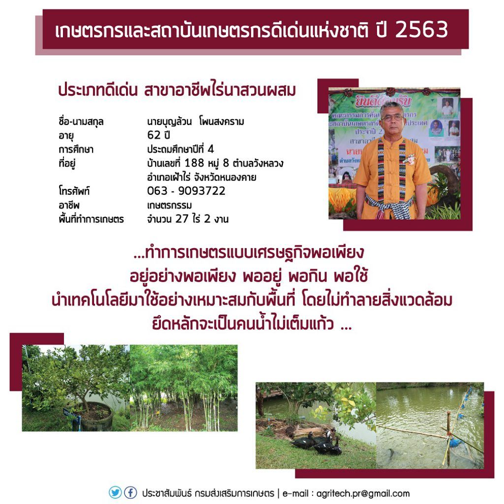 3. สาขาอาชีพไร่นาสวนผสม ได้แก่ นายบุญล้วน โพนสงคราม ปลูกพืชหลัก คือ ทำนา จำนวน 8 ไร่ สวนยางพารา จำนวน 7 ไร่ ไม้ผล ไม้ยืนต้น พืชผัก จำนวน 5 ไร่ สวนไผ่เลี้ยง จำนวน 2 ไร่ และไผ่บงหวาน จำนวน 1 ไร่ ที่อยู่ บ้านเลขที่ 188 ม.8 ต.วังหลวง อ.เฝ้าไร่ จังหวัดหนองคาย โทรศัพท์ 063 909 3722