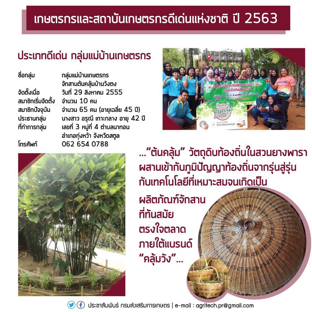 3. กลุ่มแม่บ้านเกษตรกร ได้แก่ กลุ่มแม่บ้านเกษตรกรจักสานต้นคลุ้มบ้านวังตง ที่ทำการกลุ่มเลขที่ 3 หมู่ที่ 4 ตำบลนาทอน อำเภอทุ่งหว้า จังหวัดสตูล โทรศัพท์ 062 654 0788