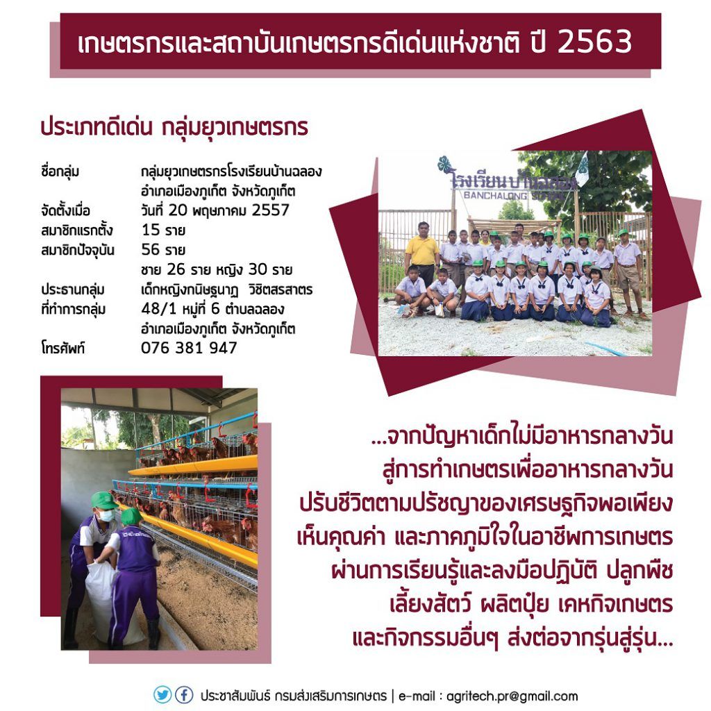 4. กลุ่มยุวเกษตรกร ได้แก่ กลุ่มยุวเกษตรกรโรงเรียนบ้านฉลอง จังหวัดภูเก็ต ที่ทำการกลุ่มเลขที่ 48/1 หมู่ที่ 6 ตำบลฉลอง อำเภอเมืองภูเก็ต จังหวัดภูเก็ต โทรศัพท์ 076 381 947
