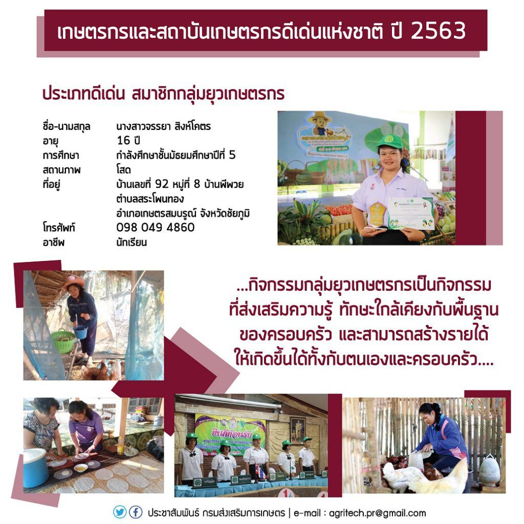 2. สมาชิกกลุ่มยุวเกษตร ได้แก่ นางสาวจรรยา สิงห์โคตร ประธานสภายุวเกษตรกรโรงเรียนโนนกอกวิทยา ที่อยู่บ้านเลขที่ 92 หมู่ที่ 8 บ้านพีพวย ตำบลสระโพนทอง อำเภอเกษตรสมบูรณ์ จังหวัดชัยภูมิ โทรศัพท์ 098 049 4860