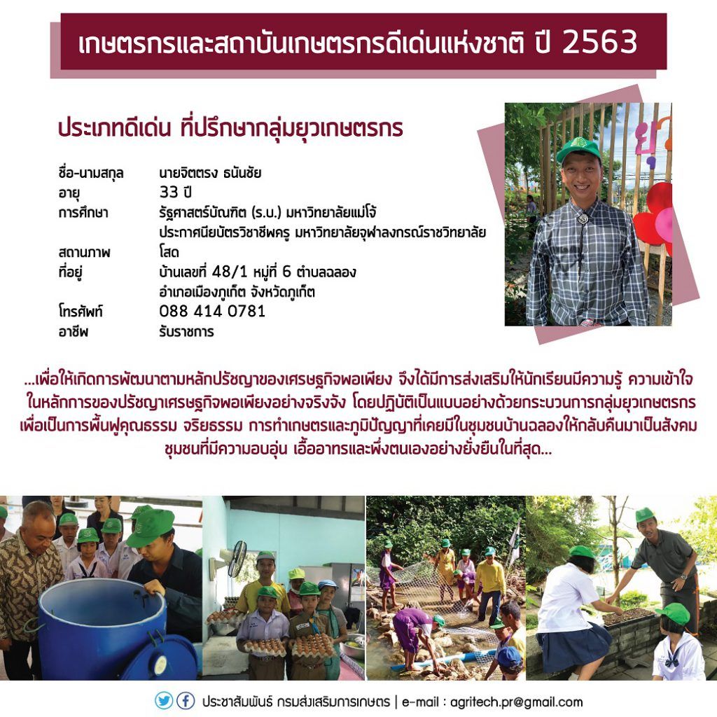 1. ที่ปรึกษากลุ่มยุวเกษตรกร ได้แก่ นายจิตตรง ธนันชัย ที่ปรึกษากลุ่มยุวเกษตรกรโรงเรียนบ้านฉลอง ที่อยู่บ้านเลขที่ 48/1 หมู่ที่ 6 ตำบลฉลอง อำเภอเมืองภูเก็ต จังหวัดภูเก็ต โทรศัพท์ 088 414 0781