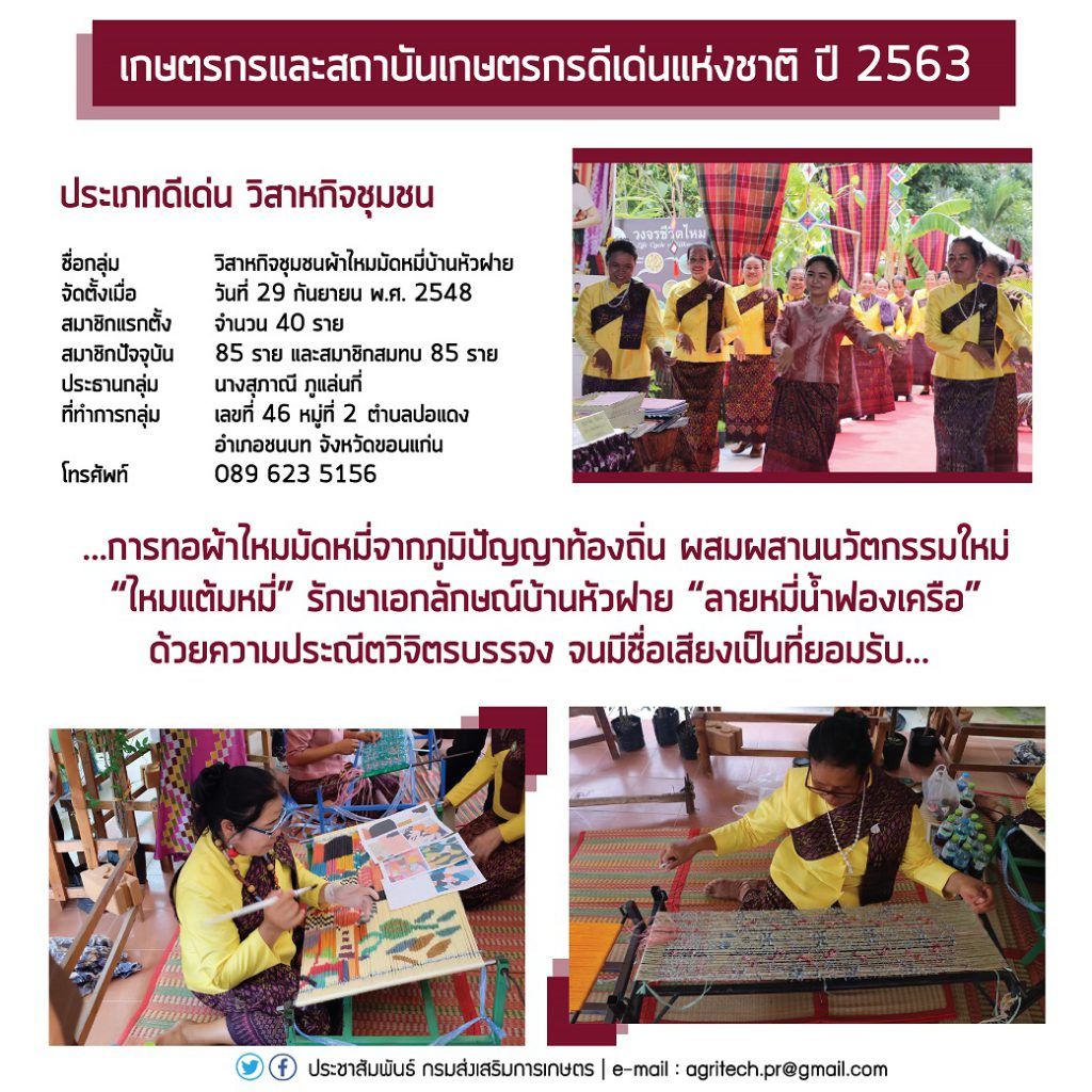 5. วิสาหกิจชุมชน ได้แก่ วิสาหกิจชุมชนผ้าไหมมัดหมี่บ้านหัวฝาย ที่ทำการเลขที่ 46 หมู่ที่ 2 ตำบลปอแดง อำเภอชนบท จังหวัดขอนแก่น โทรศัพท์ 089 623 5156