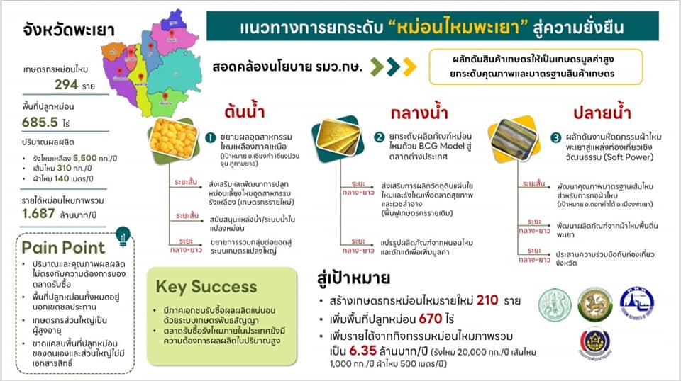 โดยในส่วนของกรมหม่อนไหมได้เสนอแนวทางการยกระดับ “หม่อนไหมพะเยา” สู่ความยั่งยืน เพื่อสร้างเกษตรกรหม่อนไหมรายใหม่และเพิ่มรายให้แก่เกษตรกรหม่อนไหมอย่างยั่งยืน