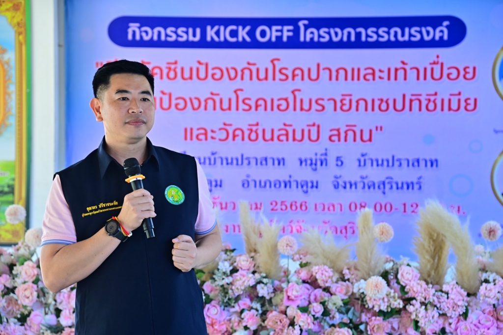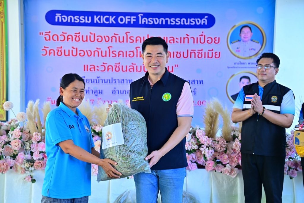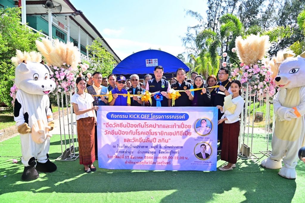 นายไชยา พรหมา รัฐมนตรีช่วยว่าการกระทรวงเกษตรและสหกรณ์ ได้มอบหมาย นายคุณากร ปรีชาชนะชัย ผู้ช่วยเลขานุการรัฐมนตรีว่าการกระทรวงเกษตรและสหกรณ์ เป็นประธานเปิดกิจกรรม Kick off “โครงการการรณรงค์ฉีดวัคซีนป้องกันโรคปากและเท้าเปื่อย วัคซีนป้องกันโรคเฮโมรายิกเซปทิซีเมีย และวัคซีนลัมปีสกิน ครั้งที่ 1/2567 โดยมีผู้บริหาร เจ้าหน้าที่สังกัดกระทรวงเกษตรและสหกรณ์ และเจ้าหน้าที่ส่วนจังหวัดให้การต้อนรับ ณ โรงเรียนบ้านปราสาท หมู่ 5 ตำบลท่าตูม อำเภอท่าตูม จังหวัดสุรินทร์ สำหรับวัตถุประสงค์ของการจัดงานครั้งนี้ เพื่อสร้างความรู้ความเข้าใจให้เกษตรกรตระหนักถึงความสำคัญในการฉีดวัคซีนป้องกันโรคระบาดสัตว์ ซึ่งสามารถช่วยลดความสูญเสียให้เกษตรกรผู้เลี้ยงสัตว์ในพื้นที่ และสามารถช่วยให้ปศุสัตว์มีคุณภาพดีสามารถสร้างรายได้ให้กับเกษตรกรมากขึ้น