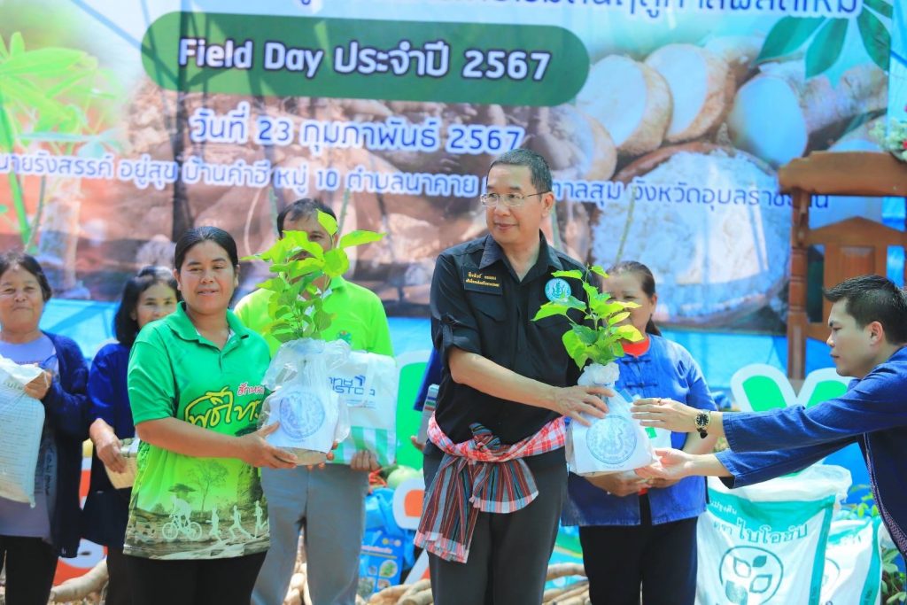 สำหรับวันถ่ายทอดผลงานวิจัยการใช้ปุ๋ยอินทรีย์ตามค่าวิเคราะห์ดินสำหรับมันสำปะหลังอินทรีย์สู่เกษตรกรเพื่อเริ่มต้นฤดูกาลผลิตใหม่ Field Day ประจำปี 2567 ณ แปลงเกษตรกร นายรังสรรค์ อยู่สุข บ้านคำฮี หมู่ 10 ตำบลนาคาย อำเภอตาลสุม จังหวัดอุบลราชธานี ในครั้งนี้ มีความแตกต่างจากการจัดงาน Field Day ที่ผ่านมา โดยมีการนำเสนอผลงานวิจัยและถ่ายทอดเทคโนโลยีการใช้ปุ๋ยอินทรีย์ตามค่าวิเคราะห์ดิน สำหรับมันสำปะหลังอินทรีย์ ภายใต้โครงการ “การถ่ายทอดเทคโนโลยีการผลิตมันสำปะหลังในระบบอินทรีย์ด้วยกลไก ตลาดนำการผลิต” ด้วยความร่วมมือระหว่าง กรมส่งเสริมการเกษตร โดยสำนักงานเกษตรจังหวัดอุบลราชธานี สำนักงานพัฒนาการวิจัยการเกษตร สำนักงานพัฒนาวิทยาศาสตร์และเทคโนโลยีแห่งชาติ กรมวิชาการเกษตร โดยสำนักวิจัยและพัฒนาการเกษตรเขตที่ 4 อุบลราชธานี และ บริษัทอุบลไบโอเอทานอล จำกัด (มหาชน) โดยมีเป้าหมายเป็นกลุ่มเกษตรกร ตำบลนาคาย อำเภอตาลสุมและตำบลสำโรง อำเภอโพธิ์ไทร จังหวัดอุบลราชธานี กลุ่มเกษตรกรตำบลคูเมือง ตำบลฟ้าหยาด อำเภอมหาชนะชัย จังหวัดยโสธร กลุ่มเกษตรกรตำบลหนองไฮ อำเภอปทุมราชวงศา จังหวัดอำนาจเจริญ จำนวน 160 คน พื้นที่ปลูก 738 ไร่ ซึ่งมีการนำเสนอผลการเรียนรู้ที่ได้ถ่ายทอดให้แก่เกษตรกรต้นแบบ ได้แก่ แนวทางการผลิตมันสำปะหลังอินทรีย์และการรับรองมาตรฐานอินทรีย์ การตรวจวิเคราะห์ดินและการใช้ปุ๋ยอินทรีย์ตามค่าวิเคราะห์ดินโดยเทคโนโลยี Smart NPK และการป้องกันกำจัดโรคไวรัสใบด่างมันสำปะหลังด้วยชุดตรวจโรคไวรัสใบด่างมันสำปะหลังแบบ Strip Test ผลการดำเนินงานพบว่า แปลงต้นแบบที่ใช้ปุ๋ยอินทรีย์ตามค่าวิเคราะห์ดิน ร้อยละ 80 มีค่าวิเคราะห์ดินที่ดีขึ้น จำนวนหัวต่อเหง้าเพิ่มขึ้น ปริมาณผลผลิตเพิ่มขึ้น และกำไรสุทธิเพิ่มขึ้นร้อยละ 20 – 30 ชี้ให้เห็นว่า การลงทุนเพิ่มจากการใช้ปุ๋ยอินทรีย์ตามค่าวิเคราะห์ดินนั้นให้ผลกำไรที่เพิ่มขึ้นตามมาด้วย