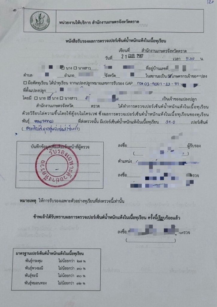 นายพีรพันธ์ คอทอง อธิบดีกรมส่งเสริมการเกษตร กล่าวว่า ผลการตรวจก่อนตัด ณ จุดดำเนินการ 3 จังหวัดภาคตะวันออก (ข้อมูล ณ วันที่ 19 เมษายน 2567) พบว่า มีจำนวนตัวอย่างส่งตรวจ รวม 8,428 ตัวอย่าง แบ่งเป็นจังหวัดจันทบุรี มี 13 จุดบริการ จำนวน 4,697 ตัวอย่าง ตรวจผ่านเกณฑ์ ร้อยละ 78.26 จังหวัดตราด มี 7 จุดบริการ จำนวน 2,460 ตัวอย่าง ตรวจผ่านเกณฑ์ ร้อยละ 70.12 และจังหวัดระยอง มี 8 จุดบริการ จำนวน 1,267 ตัวอย่าง ตรวจผ่านเกณฑ์ ร้อยละ 76.5 โดยตัวอย่างที่จะผ่านการตรวจได้ต้องมีเปอร์เซ็นต์น้ำหนักแห้งในเนื้อทุเรียนเท่ากับ หรือมากกว่าเกณฑ์ตามมาตรฐานสินค้าเกษตรทุเรียน (มกษ. 3-2556) ตามที่กำหนดข้างต้น หากไม่ผ่านเกณฑ์ให้นำตัวอย่างมาตรวจซ้ำใหม่อีกครั้ง ซึ่งจะเห็นได้ว่าในช่วงต้นฤดูกาลผลิตนี้ ทุกจังหวัดมีทุเรียนผ่านมาตรฐานเปอร์เซ็นต์น้ำหนักแห้งสูงถึงร้อยละ 70 ขึ้นไป ทำให้เห็นถึงแนวโน้มที่ดีที่เกษตรกร และมือตัดทุเรียนได้ให้ความร่วมมือเป็นอย่างดีในการปฏิบัติตามมาตรการที่ทุกจังหวัดกำหนด ซึ่งจะเป็นการช่วยสร้างความมั่นใจให้กับผู้บริโภคในคุณภาพของทุเรียนภาคตะวันออกอีกด้วย