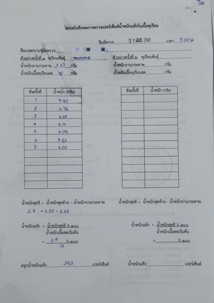 นายพีรพันธ์ คอทอง อธิบดีกรมส่งเสริมการเกษตร ติดตามร้อยเอก ธรรมนัส พรหมเผ่า รัฐมนตรีว่าการกระทรวงเกษตรและสหกรณ์ ลงพื้นที่จังหวัดจันทบุรีติดตามการดำเนินงานตามมาตรการ “ตรวจก่อนตัด” เพื่อป้องกันทุเรียนอ่อนออกสู่ตลาด ซึ่งจังหวัดในภาคตะวันออก ประกอบด้วย จังหวัดจันทบุรี จังหวัดระยอง และจังหวัดตราดได้แต่งตั้งคณะทำงานและชุดปฏิบัติการเฉพาะกิจตรวจก่อนตัด (ตรวจเปอร์เซ็นต์น้ำหนักแห้งในเนื้อทุเรียนก่อนตัด) ในฤดูกาลผลิต ปี 2566/67 เพื่อควบคุมและป้องกันไม่ให้มีทุเรียนอ่อนออกสู่ตลาด โดยกำหนดระดับความอ่อนแก่ของทุเรียน ด้วยวิธีการตรวจสอบเปอร์เซ็นต์น้ำหนักเนื้อแห้งของทุเรียน สอดคล้องตามค่ามาตรฐานเปอร์เซ็นต์น้ำหนักแห้งในเนื้อทุเรียนตามมาตรฐานสินค้าเกษตร มกษ. 3-2556 ของสำนักงานมาตรฐานสินค้าเกษตรและอาหารแห่งชาติ (มกอช.) กำหนดค่าเฉลี่ยของเปอร์เซ็นต์น้ำหนักแห้งในเนื้อทุเรียนขั้นต่ำสำหรับการบริโภคในแต่ละสายพันธุ์ ดังนี้ 1) พันธุ์กระดุม ไม่น้อยกว่า 27 เปอร์เซ็นต์น้ำหนักแห้ง 2) พันธุ์ชะนี ไม่น้อยกว่า 30 เปอร์เซ็นต์น้ำหนักแห้ง 3) พันธุ์พวงมณี ไม่น้อยกว่า 30 เปอร์เซ็นต์น้ำหนักแห้ง และ 4) พันธุ์หมอนทอง ไม่น้อยกว่า 32 เปอร์เซ็นต์น้ำหนักแห้ง หากเปอร์เซ็นต์น้ำหนักแห้งในเนื้อทุเรียนต่ำกว่านี้ ถือว่าเป็นทุเรียนอ่อน เน้นกำชับแนวคิด “ออกก่อนอ่อนไม่มี” รวมทั้งกำหนดวันเก็บเกี่ยวทุเรียนภาคตะวันออก ปี 2567 ดังนี้ 1) พันธุ์กระดุม วันที่ 15 เมษายน 2567 2) พันธุ์ชะนี และพวงมณี วันที่ 5 พฤษภาคม 2567 และ 3) พันธุ์หมอนทอง วันที่ 20 พฤษภาคม 2567