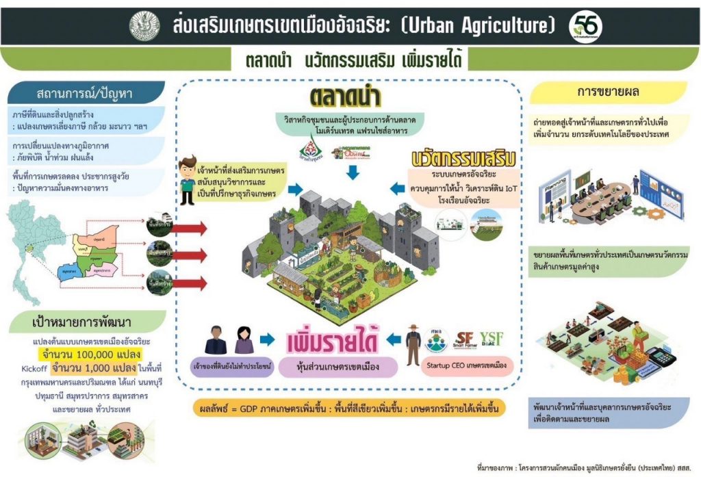 นายรพีทัศน์ อุ่นจิตตพันธ์ รองอธิบดีกรมส่งเสริมการเกษตร กล่าวว่า กรมส่งเสริมการเกษตรขับเคลื่อนโครงการส่งเสริมเกษตรเขตเมืองอัจฉริยะ (Urban Agriculture) ตามนโยบาย “ตลาดนำ นวัตกรรมเสริม เพิ่มรายได้” ของกระทรวงเกษตรและสหกรณ์ โดยมีเป้าหมายการพัฒนาแปลงต้นแบบเกษตรเขตเมืองอัจฉริยะ จำนวน 100,000 แปลงทั่วประเทศ สำหรับปีงบประมาณ พ.ศ. 2567 กำหนดการพัฒนาพื้นที่เขตเมืองที่รกร้างว่างเปล่า หรือพื้นที่ทำการเกษตรที่ใช้ประโยชน์ไม่เต็มประสิทธิภาพ จำนวน 1,000 แปลง ในพื้นที่ 5 จังหวัดนำร่อง คือ กรุงเทพมหานคร นนทบุรี ปทุมธานี สมุทรปราการ และสมุทรสาคร โดยมีกลไกการส่งเสริมเกษตรเขตเมืองอัจฉริยะ ประกอบด้วย 1. เจ้าของที่ดิน ที่ต้องการพัฒนาพื้นที่รกร้างว่างเปล่าหรือใช้ประโยชน์ไม่เต็มประสิทธิภาพ 2. เกษตรกร ผู้ประกอบการเกษตรเขตเมืองที่มีประสบการณ์ความรู้บริหารจัดการแปลงเกษตรเขตเมือง 3. เจ้าของนวัตกรรมระบบเกษตรอัจฉริยะ ได้แก่ ระบบฟาร์มเกษตรอัจฉริยะ โรงเรือนปลูกพืช เป็นต้น 4. วิสาหกิจชุมชนหรือผู้ประกอบการด้านตลาด ทำหน้าที่รวบรวมและกระจายผลผลิตของฟาร์มเกษตรเขตเมือง สู่ตลาดระดับต่างๆ ห้างร้าน โรงงานแปรรูป กลุ่มพ่อค้าแม่ค้า บุคคลทั่วไป และตลาดออนไลน์ และ 5. เจ้าหน้าที่ส่งเสริมการเกษตร สนับสนุนวิชาการด้านพืช การวางแผนการผลิต การป้องกันอารักขาพืช การประสานงานจัดหาช่องทางตลาด และเป็นที่ปรึกษาธุรกิจเกษตรให้แก่หุ้นส่วนเกษตรเขตเมือง