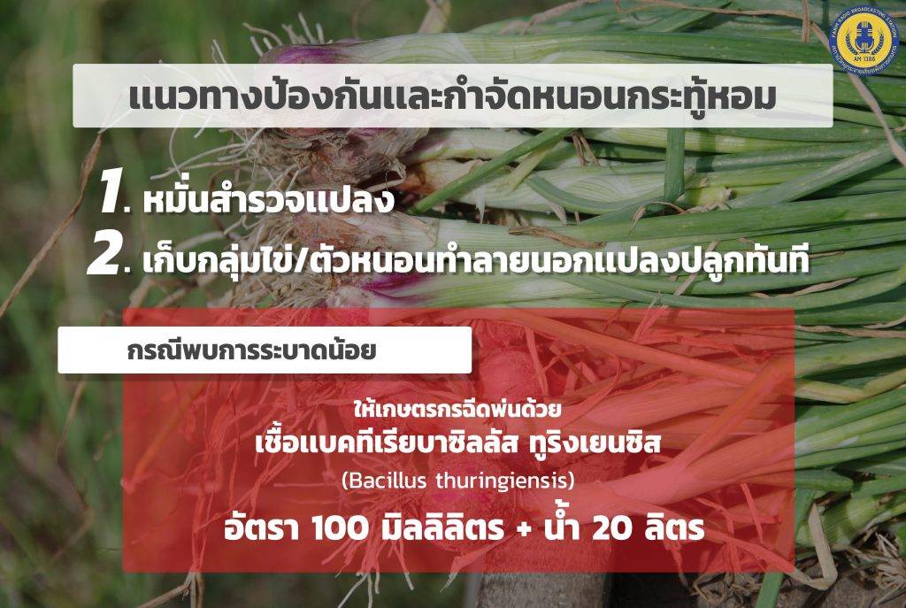 สำหรับแนวทางการป้องกันและกำจัดหนอนกระทู้หอม เกษตรกรควรหมั่นสำรวจตรวจเก็บกลุ่มไข่และตัวหนอนกระทู้หอมในแปลงมาทำลายนอกแปลงปลูกทันที เพื่อช่วยลดการระบาด ส่วนในระยะที่ตัวหนอนมีขนาดเล็กและพบการระบาดน้อย ให้เกษตรกรพ่นด้วยเชื้อแบคทีเรียบาซิลลัส ทูริงเยนซิส (Bacillus thuringiensis) อัตรา 100 มิลลิลิตรต่อน้ำ 20 ลิตร