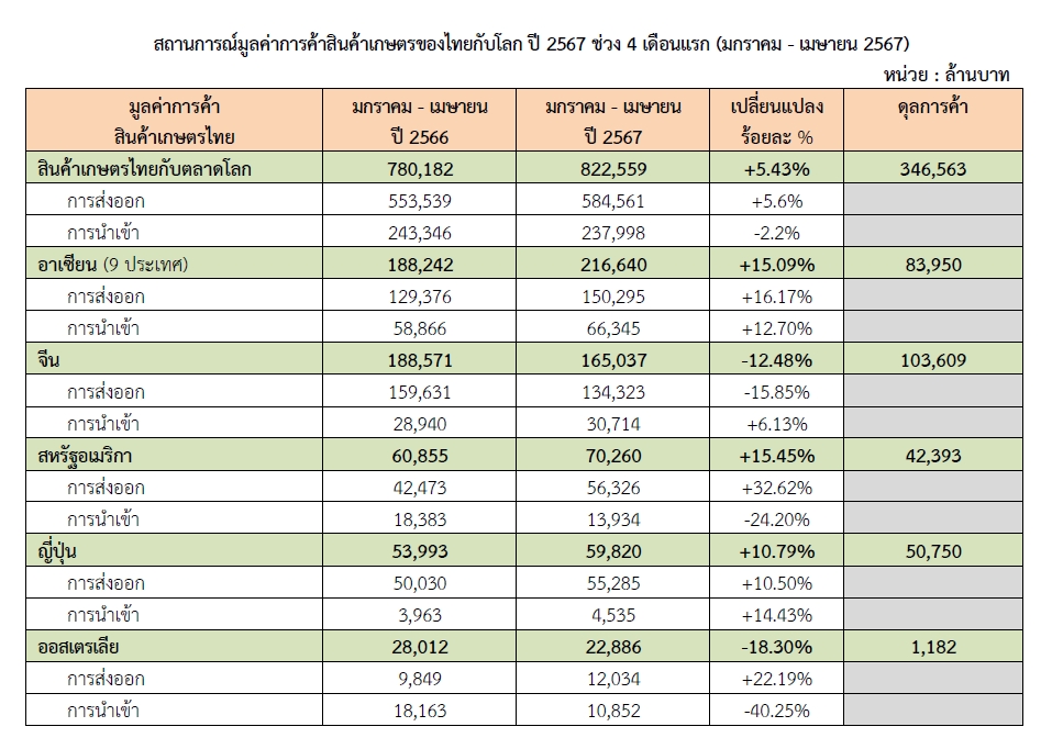 เปิดเผยถึงภาพรวมสถานการณ์การค้าสินค้าเกษตรของไทยกับโลก ปี 2567 ช่วง 4 เดือนแรก (มกราคม – เมษายน 2567) พบว่า ไทยมีมูลค่าการค้ารวม 822,559 ล้านบาท เพิ่มขึ้นร้อยละ 5.43 จากช่วงเดียวกันของปีที่ผ่านมา โดยการขยายตัวของมูลค่าการค้ารวมเป็นผลจากการขยายตัวของการส่งออก ซึ่งมีมูลค่า 584,561 ล้านบาท เพิ่มขึ้นร้อยละ 5.6 จากช่วงเดียวกันของปีที่ผ่านมา นอกจากนี้ พบว่า ไทยมีมูลค่านำเข้า 237,998 ล้านบาท ลดลงร้อยละ 2.2 ส่งผลให้การค้าสินค้าเกษตรในภาพรวมของไทยในช่วง 4 เดือนแรกปี 2567 เกินดุลการค้า 346,563 ล้านบาท