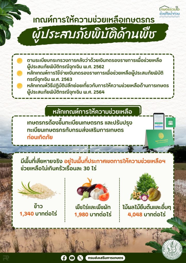 อธิบดีกรมส่งเสริมการเกษตร กล่าวเพิ่มเติมว่า การดำเนินการให้ความช่วยเหลือของกรมส่งเสริมการเกษตร กรณีพื้นที่เกษตรได้รับความเสียหายเกษตรกรจะได้รับความช่วยเหลือตามระเบียบกระทรวงการคลังว่าด้วยเงินทดรองราชการ เพื่อช่วยเหลือผู้ประสบภัยพิบัติกรณีฉุกเฉิน พ.ศ. 2562 และหลักเกณฑ์วิธีปฏิบัติปลีกย่อยเกี่ยวกับการให้ความช่วยเหลือด้านการเกษตรผู้ประสบภัยพิบัติกรณีฉุกเฉิน พ.ศ. 2564 โดยเกษตรกรจะต้องขึ้นทะเบียนและปรับปรุงทะเบียนเกษตรกรไว้กับกรมส่งเสริมการเกษตรก่อนเกิดภัย โดยจะได้รับความช่วยเหลือครัวเรือนละไม่เกิน 30 ไร่ แบ่งเป็น ข้าว ไร่ละ 1,340 บาท พืชไร่และพืชผัก ไร่ละ 1,980 บาท ไม้ผลไม้ยืนต้นและอื่น ๆ ไร่ละ 4,048 บาท