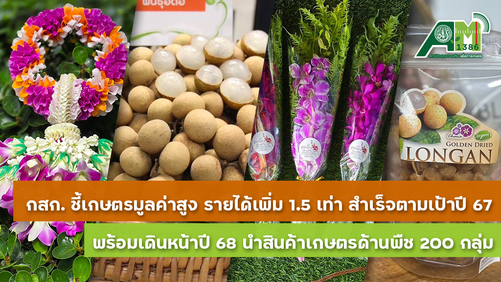 กรมส่งเสริมการเกษตรชี้ เกษตรมูลค่าสูง รายได้เพิ่ม 1.5 เท่า สำเร็จตามเป้าปี 67 พร้อมเดินหน้าปี 68 นำสินค้าเกษตรด้านพืช 200 กลุ่ม ยกระดับรายได้ สู่การพึ่งพาตนเอง