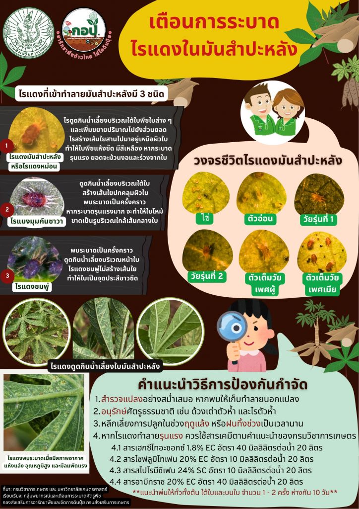 กรมส่งเสริมการเกษตรเตือนเกษตรกรผู้ปลูกมันสำปะหลังในทุกภาคของประเทศไทย เฝ้าระวังการระบาดของไรแดงในมันสำปะหลัง เนื่องจากมันสำปะหลังในพื้นที่ส่วนใหญ่ขณะนี้มีอายุ 1 – 3 เดือน และในช่วงนี้มีสภาพอากาศแห้งแล้ง อุณหภูมิสูง เอื้อต่อการระบาดของไรแดงในมันสำปะหลังได้ดี โดยไรศัตรูพืชเหล่านี้จะมีลักษณะปากที่แตกต่างจากไรทั่ว ๆ ไป คือ จะมีอวัยวะที่เรียกว่า chelicerae ซึ่งเป็นส่วนประกอบที่สำคัญของปาก มีลักษณะเป็นเข็มแหลม (stylets) เพื่อใช้ทิ่มแทงเข้าไปในเนื้อเยื่อหรือเซลล์ของพืชอาศัย เพื่อดูดกินน้ำเลี้ยง ทำให้เกิดแผลบนผิวของพืชบริเวณนั้น