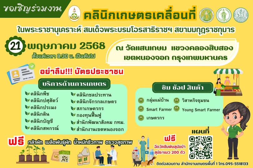 ขอเชิญเกษตรกรและประชาชนผู้สนใจ ร่วมงานคลินิกเกษตรเคลื่อนที่ในพระราชานุเคราะห์สมเด็จพระบรมโอรสาธิราชฯ สยามมกุฎราชกุมาร ในวันพุธที่ 21 พฤษภาคม 2568 โดยภายในงานมีบริการทางด้านการเกษตร คลินิกพืช คลินิกปศุสัตว์ คลินิกประมง คลินิกดิน คลินิกบัญชี คลินิกสหกรณ์ คลินิกชลประทาน คลินิกจักรกลเกษตร สภาเกษตรกร กองทุนฟื้นฟู สำนักพัฒนาสังคม กทม. และสำนักงานเขตหนองจอก แจกฟรี!! พันธุ์ไม้ น้ำหมักชีวภาพ ฉีดวัคซีนพิษสุนัขบ้าสุนัข / แมว 200 ตัว และชิม ช้อป สินค้า จากกลุ่มแม่บ้าน เกษตรกร และวิสาหกิจชุมชน ณ วัดแสนเกษม แขวงคลองสิบสอง เขตหนองจอก กรุงเทพมหานคร
