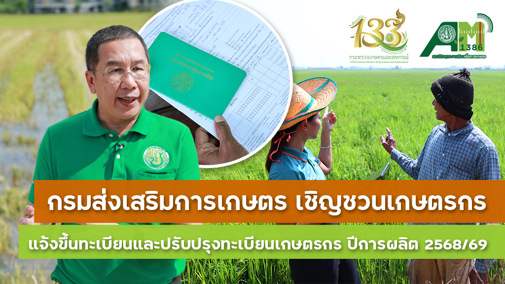 กรมส่งเสริมการเกษตร ขอเชิญชวนเกษตรกรทั่วประเทศ ร่วมกันขึ้นทะเบียนและปรับปรุงทะเบียนเกษตรกรประจำปี 2568/69 เพื่อให้ข้อมูลการเพาะปลูกของท่านเป็นปัจจุบัน ชัดเจน และสามารถนำไปใช้เป็นฐานข้อมูลสำคัญในการวางแผนพัฒนา สนับสนุน และออกมาตรการต่าง ๆ ให้ตรงกับความต้องการของเกษตรกรอย่างแท้จริง