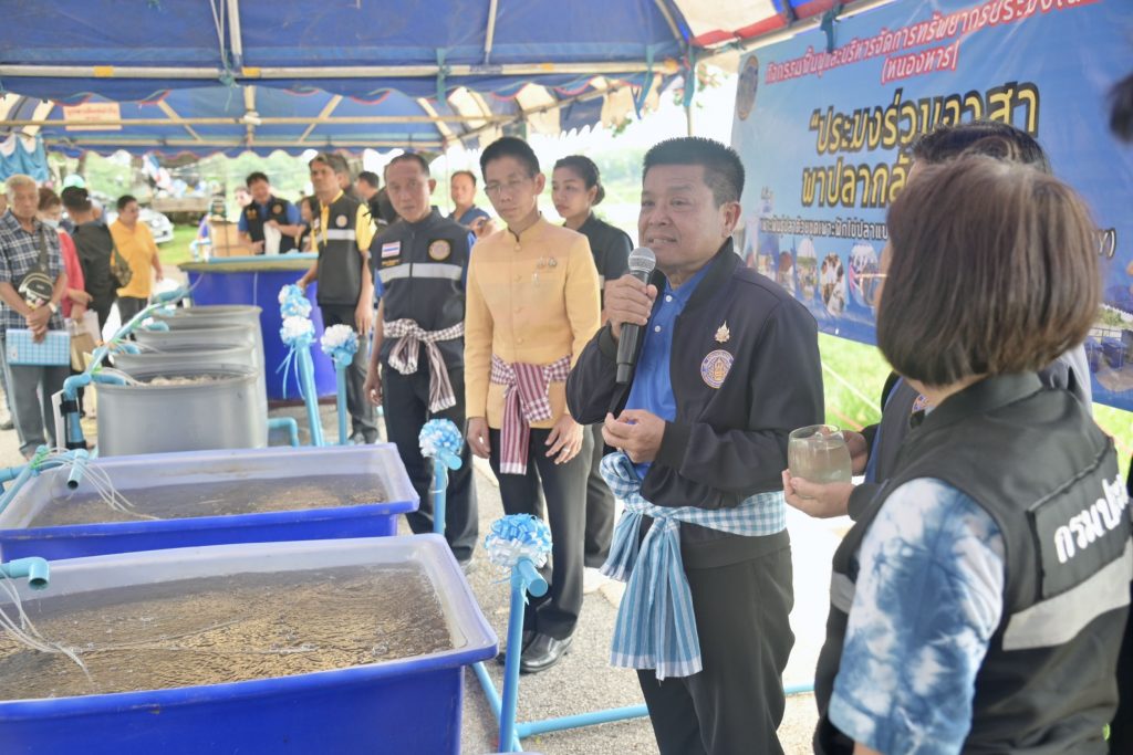 วันอังคารที่ 27 พฤษภาคม 2568 เวลา 09.30 น. ณ สวนสาธารณะดอนเกิน บ้านท่าแร่สามัคคี หมู่ 6 ตำบลท่าแร่ อำเภอเมือง จังหวัดสกลนคร นายบัญชา สุขแก้ว อธิบดีกรมประมง ให้เกียรติเป็นประธานในพิธีเปิด “โครงการฟื้นฟูและบริหารจัดการทรัพยากรประมงแหล่งน้ำสำคัญหนองหาร จังหวัดสกลนคร ประจำปี 2568 ประมงร่วมอาสาพาปลากลับบ้าน” พร้อมด้วย คณะผู้บริหารกรมประมง ผู้นำชุมชน ข้าราชการ และประชาชนในพื้นที่ จำนวนกว่า 300 คน เข้าร่วม โดยภายในงาน ประกอบด้วย การปล่อยพันธุ์ปลา กว่า 5 ล้านตัว เป็นปลาวัยอ่อนอายุ 2 วัน ซึ่งได้จากการเพาะพันธุ์ด้วยชุดเพาะฟักเคลื่อนที่ (Mobile Hatchery) ลงในแหล่งน้ำหนองหาร จังหวัดสกลนคร ประกอบด้วยปลาตะเพียนทอง จำนวน 1,500,000 ตัว ปลาตะเพียนขาว จำนวน 1,200,000 ตัว ปลากระแห จำนวน 1,000,000 ตัว ปลาสร้อยขาว จำนวน 1,000,000 ตัว ปลากดเหลือง จำนวน 300,000 ตัว รวมถึงปลาตะเพียนขาวและปลาหมอตาล ขนาด 2–3 เซนติเมตร จำนวน 500,000 ตัว และพันธุ์กุ้งก้ามกราม จำนวน 200,000 ตัว นอกจากนี้ ยังมีการปล่อยพันธุ์ปลาตะเพียนขาววัยอ่อนออนไลน์จำนวน 5,000,000 ตัว จากชุดเพาะฟักเคลื่อนที่ในพื้นที่บ้านปากบัง ลงในลำน้ำก่ำ อำเภอนาแก จังหวัดนครพนม ภายในงานยังจัดนิทรรศการให้ความรู้ด้านการบริหารจัดการทรัพยากรประมงในหนองหารและลำน้ำก่ำ การจัดแสดงรูปแบบชุดเพาะพันธุ์สัตว์น้ำเคลื่อนที่ ผลิตภัณฑ์แปรรูปสัตว์น้ำของชุมชน และผลงานการวาดภาพระบายสีของนักเรียนในหัวข้อ “หนองหารน่าอยู่” พร้อมนำเสนอผลสำเร็จตลอดระยะเวลา 5 ปีของ “โครงการประมงร่วมอาสา…พาปลากลับบ้าน” โดยข้อมูลจากการดำเนินโครงการฯ ตลอดระยะเวลาโครงการ พบว่าสามารถเพิ่มจำนวนประชากรปลาเพื่อให้เป็นแหล่งอาหารโปรตีนแล้วกว่า 448 ตัน สามารถสร้างมูลค่าและเป็นรายได้เสริมให้กับชุมชนได้กว่า 35,820,000 บาท