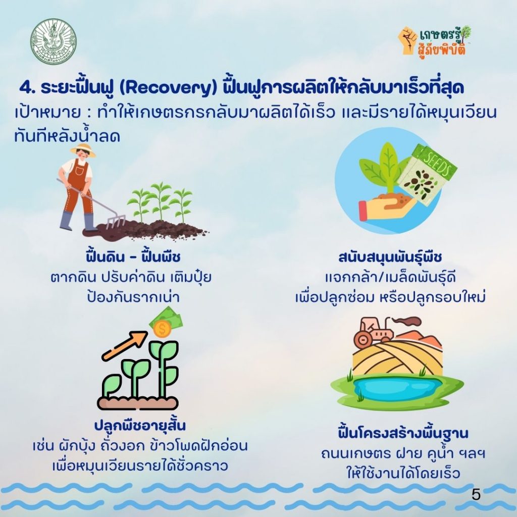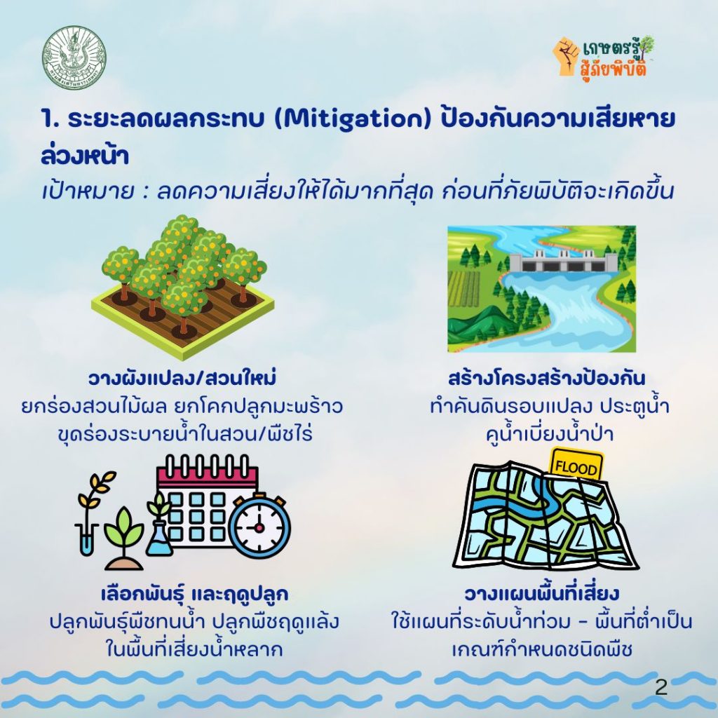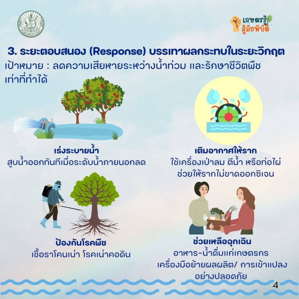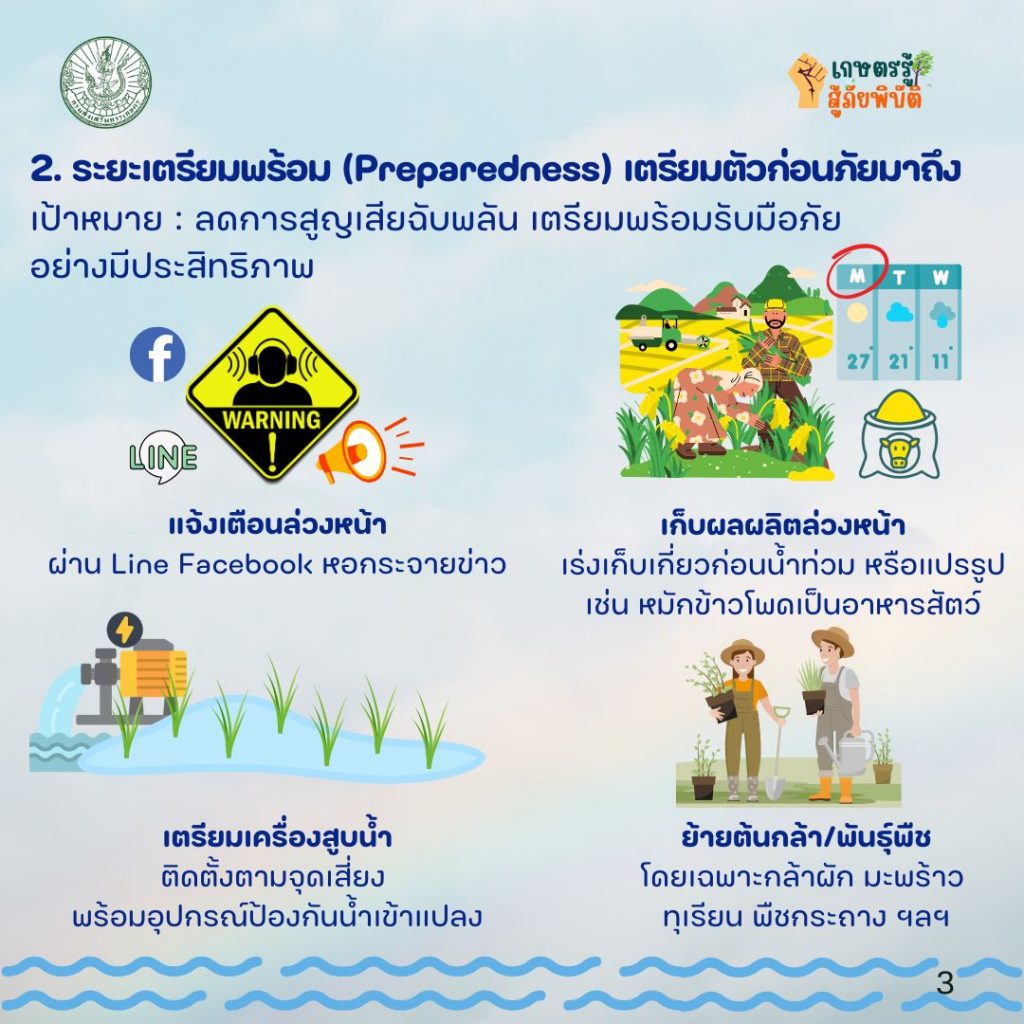 นายพีรพันธ์ คอทองอธิบดีกรมส่งเสริมการเกษตรเปิดเผยว่าปี 2568 ประเทศไทยเข้าสู่ฤดูฝน เมื่อวันที่ 15 พฤษภาคม 2568 – ประมาณกลางเดือนตุลาคม 2568 (กรมอุตุนิยมวิทยา) กรมส่งเสริมเกษตรกร ห่วงใยเกษตรกรที่อยู่ในพื้นที่เสี่ยงภัยพิบัติ จึงได้กำหนดแนวทางจัดการน้ำท่วมเพื่อความพร้อมรับมือ – ป้องกัน – ฟื้นฟูพื้นที่เกษตรที่ประสบภัยพิบัติ โดยขับเคลื่อนให้เจ้าหน้าที่ส่งเสริมการเกษตรทุกพื้นที่เดินหน้าตามแนวทางจัดการน้ำท่วมภาคเกษตรไทย 4 ระยะ เพื่อป้องกันและลดผลกระทบจากภัยพิบัติ ประกอบด้วย 1.ระยะลดผลกระทบ (Mitigation) ป้องกันความเสียหายล่วงหน้าก่อนเกิดภัย โดยวางผังแปลงเพาะปลูกใหม่ให้มีร่องระบายน้ำ และสร้างคันดินหรือประตูน้ำ รวมทั้งเลือกพันธุ์พืชและช่วงเวลาฤดูเพาะปลูกให้เหมาะสม 2. ระยะเตรียมพร้อม (Preparedness) เตรียมตัวก่อนภัยมาถึง โดยหมั่นติดตามพยากรณ์อากาศและช่องทางแจ้งเตือนภัยพิบัติ เช่น หอกระจายข่าว ไลน์และเฟซบุ๊กจากหน่วยงานภาครัฐ พร้อมติดตั้งเครื่องสูบน้ำ และเตรียมแผนอพยพหรือเก็บเกี่ยวพืชกรณีฉุกเฉิน 3. ระยะตอบสนอง (Response) บรรเทาผลกระทบในระยะวิกฤต เพื่อรักษาชีวิตพืชในแปลงปลูก โดยเร่งระบายน้ำออกทันทีเมื่อระดับน้ำภายนอกลด และเติมอากาศให้รากพืช อาจใช้สารชีวภัณฑ์ เช่น เชื้อราไตรโคเดอร์มาป้องกันโรครากเน่า เป็นต้น และ 4. ระยะฟื้นฟู (Recovery) เพื่อให้เกษตรกรกลับมาผลิตได้รวดเร็ว และมีรายได้หมุนเวียนทันทีหลังน้ำลด โดยปรับสภาพฟื้นฟูดิน พลิกตากหน้าดิน และเติมปุ๋ย พร้อมสนับสนุนการปลูกพืชอายุสั้นที่สามารถจำหน่ายผลผลิตหมุนเวียนสร้างรายได้ชั่วคราวหลังประสบภัยพิบัติ