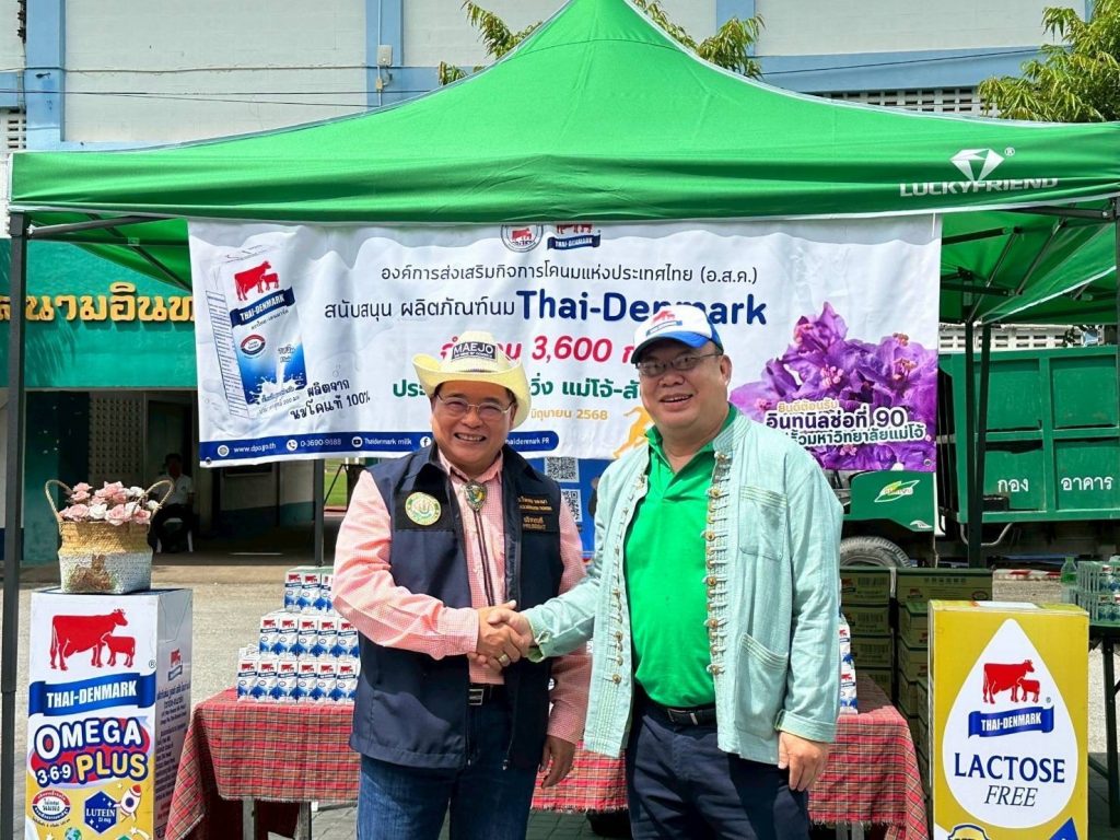 วันที่ 20 มิถุนายน 2568 ผู้ช่วยศาสตราจารย์ ดร.เกรียงไกร เจริญผล ประธานกรรมการ อ.ส.ค. ให้เกียรติร่วมมอบผลิตภัณฑ์นม ยูเอชที ตราไทย – เดนมาร์ค รสจืด ขนาด 200 มล. จำนวน 3,600 กล่อง ให้แก่มหาวิทยาลัยแม่โจ้ โดยมีรองศาสตราจารย์ ดร.วีระพล ทองมา อธิการบดีมหาวิทยาลัยแม่โจ้ พร้อมด้วย ดร.ขุนศรี ทองย้อย นายกสมาคมศิษย์เก่าแม่โจ้ และคณะร่วมรับมอบ เพื่อจัดกิจกรรมเดินวิ่ง แม่โจ้ – สันทราย ประจำปี 2568 และกิจกรรมเสริมสร้างอัตลักษณ์ลูกแม่โจ้และคุณลักษณะบัณฑิตที่พึงประสงค์ ประจำปี 2568 ในวันเสาร์ที่ 21 มิถุนายน 2568 โดยนายสมพร ศรีเมือง ผู้อำนวยการ อ.ส.ค. มอบหมายให้ นายประเสริฐ คงใหญ่ หัวหน้าสำนักงาน อ.ส.ค. ภาคเหนือตอนล่าง กำกับดูแลงานของสำนักงาน อ.ส.ค. ภาคเหนือตอนบน พร้อมด้วยนางสาวนภาพร พันธุสุข หัวหน้ากองประชาสัมพันธ์และธรรมาภิบาล ฝ่ายอำนวยการ รวมทั้งผู้บริหารและพนักงานสำนักงาน อ.ส.ค.ภาคเหนือตอนบน ออกบูธเพื่อเป็นการประชาสัมพันธ์ผลิตภัณฑ์ และสร้างการรับรู้ในตราสินค้าผลิตภัณฑ์นมไทย-เดนมาร์คให้กับนักศึกษา คณะอาจารย์ ศิษย์เก่า ของมหาวิทยาลัยอีกช่องทางหนึ่ง ณ สนามอินทนิล มหาวิทยาลัยแม่โจ้ อำเภอสันทราย จังหวัดเชียงใหม่