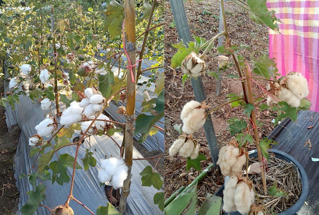 ส่วนฝ้ายเส้นใยสีขาว จะได้เส้นใยที่มีคุณภาพเหมาะสำหรับทำผ้าทอย้อมสีธรรมชาติ