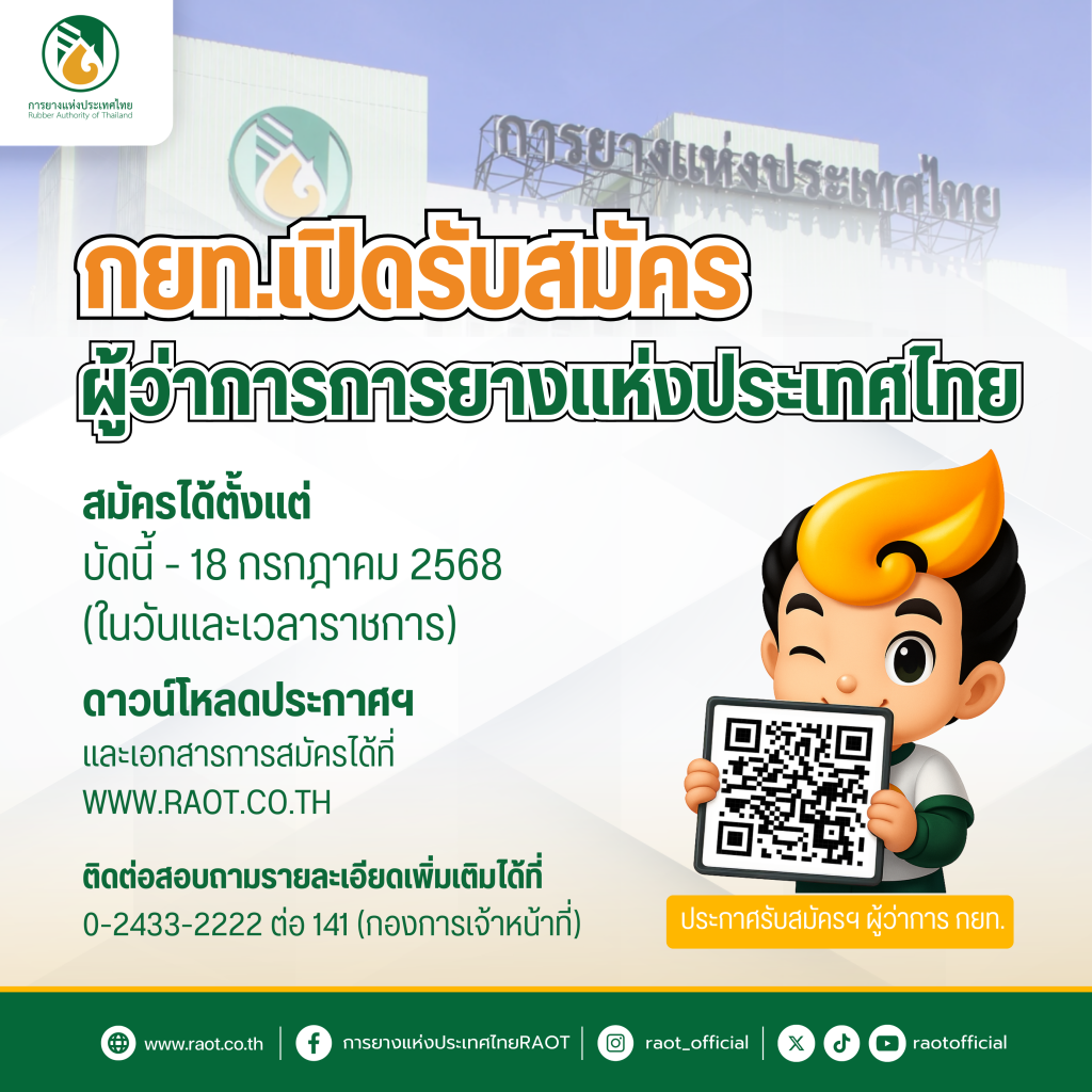 สำหรับผู้ที่สนใจสามารถดูรายละเอียดเพิ่มเติมในประกาศฯ และดาวน์โหลดใบสมัครได้ที่ www.raot.co.th โดยสามารถส่งเอกสารใบสมัครพร้อมหลักฐานการสมัครอื่นๆ ได้ด้วยตนเองหรือทางไปรษณีย์ด่วนพิเศษ (EMS) มาที่ประธานกรรมการสรรหาผู้ว่าการการยางแห่งประเทศไทย กองการเจ้าหน้าที่ ฝ่ายทรัพยากรมนุษย์ การยางแห่งประเทศไทย สำนักงานใหญ่ เลขที่ 67/25 ถนนบางขุนนนท์ แขวงบางขุนนนท์ เขตบางกอกน้อย กรุงเทพฯ 10700 ได้ตั้งแต่วันนี้ ถึงวันที่ 18 กรกฎาคม 2568 สอบถามรายละเอียดเพิ่มเติมติดต่อ กองการ-เจ้าหน้าที่ ฝ่ายทรัพยากรมนุษย์ โทร. 02-433-2222 ต่อ 141 ในวันและเวลาราชการ ทั้งนี้ จะประกาศรายชื่อผู้มีสิทธิ์แสดงวิสัยทัศน์และสัมภาษณ์ ผ่านทางเว็บไซต์ www.raot.co.th ในวันที่ 4 สิงหาคม 2568 เพื่อเข้ารับการสัมภาษณ์และแสดงวิสัยทัศน์ในวันที่ 25 สิงหาคม 2568 ต่อไป