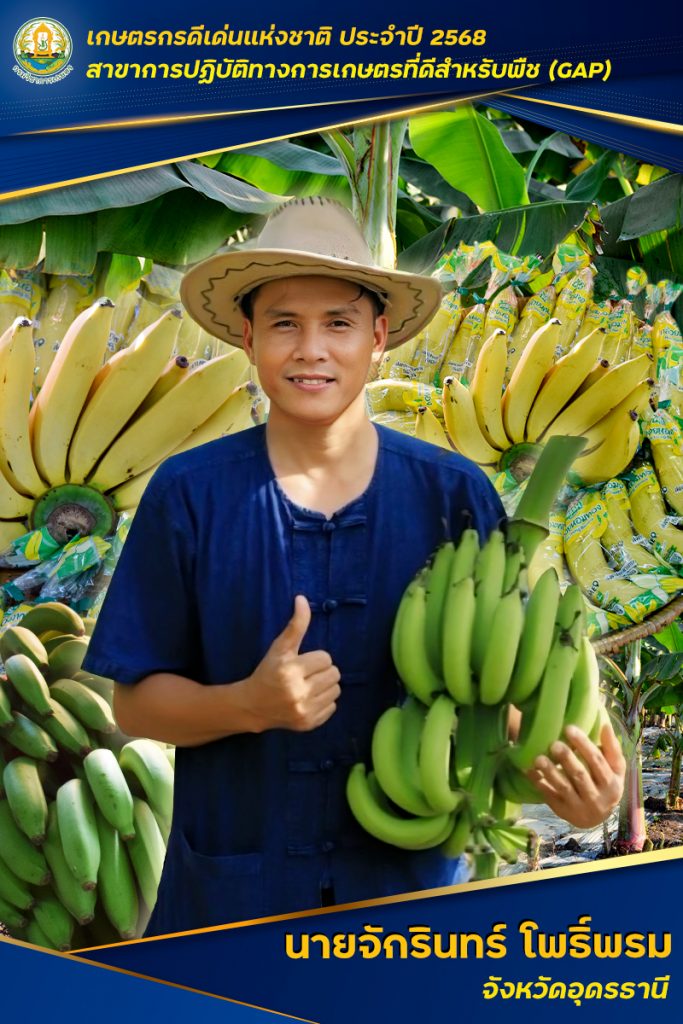 นายภัสชญภณ หมื่นแจ้ง รองอธิบดีกรมวิชาการเกษตร ในฐานะโฆษกกรมวิชาการเกษตร เปิดเผยว่า ในปี 2568 กรมวิชาการเกษตรได้คัดเลือกให้นายจักรินทร์ โพธิ์พรม เกษตรกรตำบลบ้านโคก อำเภอสร้างคอม จังหวัดอุดรธานี ได้รับรางวัลเกษตรกรดีเด่นแห่งชาติ สาขาการปฏิบัติทางการเกษตรที่ดีสำหรับพืช (GAP) โดยนายจักรินทร์เป็นเกษตรกรรายแรกที่เริ่มต้นและจุดประกายการปลูกกล้วยหอมทองเพื่อการค้าของจังหวัดอุดรธานี และมีผลงานเป็นแบบอย่างที่ดีทั้งในด้านการผลิตกล้วยหอมทอง การพัฒนาเครือข่าย และการอนุรักษ์ทรัพยากรธรรมชาติและสิ่งแวดล้อม โดยนำทุกส่วนของกล้วยหอมทองมาใช้ให้เกิดประโยชน์เป็นการลดปริมาณขยะในการผลิตพืชภายในแปลง รวมทั้งยังเป็นเกษตรกรที่เรียนรู้จากประสบการณ์จริงและนำเทคโนโลยีมาปรับใช้จนทำให้ประสบความสำเร็จจากเดิมที่เริ่มปลูกกล้วยหอมทองในพื้นที่จำนวน 3 ไร่ ปัจจุบันมีพื้นที่ปลูกกล้วยหอมทองรวมจำนวนทั้งสิ้น 600 ไร่ ทั้งในจังหวัดอุดรธานีและจังหวัดใกล้เคียง