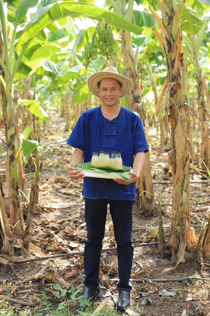 รองอธิบดีกรมวิชาการเกษตร กล่าวว่า นอกจากนี้ นายจักรินทร์ยังได้นำสารชีวภัณฑ์มาใช้ป้องกันและกำจัดโรคและแมลงศัตรูพืช เพื่อทดแทนการใช้สารเคมีในแปลงปลูกกล้วยหอมทอง เช่น การใช้เชื้อราไตรโคเดอร์มา เพื่อป้องกันโรครากเน่าโคนเน่าในกล้วยหอมทอง โดยใช้เชื้อราไตรโคเดอร์มา อัตรา 1.5 ลิตร ต่อน้ำ 200 ลิตร ละลายน้ำกรองเอากากออกจากนั้นปล่อยไปตามระบบน้ำหยด (เดือนละ 1 ครั้ง) ส่วนในช่วงฤดูฝนจะมีการใช้เชื้อราไตรโคเดอร์มาผสมน้ำ อัตรา 250 กรัมต่อน้ำ 20 ลิตร ฉีดพ่นบริเวณลำต้นและใบเพื่อป้องกันโรคที่เกิดจากเชื้อรา พร้อมกับลดการเผา โดยนำเศษวัสดุธรรมชาติที่เหลือในแปลง เช่น ต้นกล้วย ใบกล้วย มาทำเป็นปุ๋ยหมัก บางส่วน เช่น เครือกล้วย ต้นกล้วย นำไปผลิตเส้นใย สำหรับการผลิตเสื้อผ้าซึ่งเป็นนวัตกรรมที่ได้ศึกษางานวิจัยร่วมกับประเทศญี่ปุ่น รวมทั้งยังผลิตภาชนะใส่อาหารเพื่อลดขยะในแปลงตามแนวคิด zero waste ซึ่งเป็นการเพิ่มมูลค่า และเพิ่มช่องทางการตลาดได้อีกด้วย
