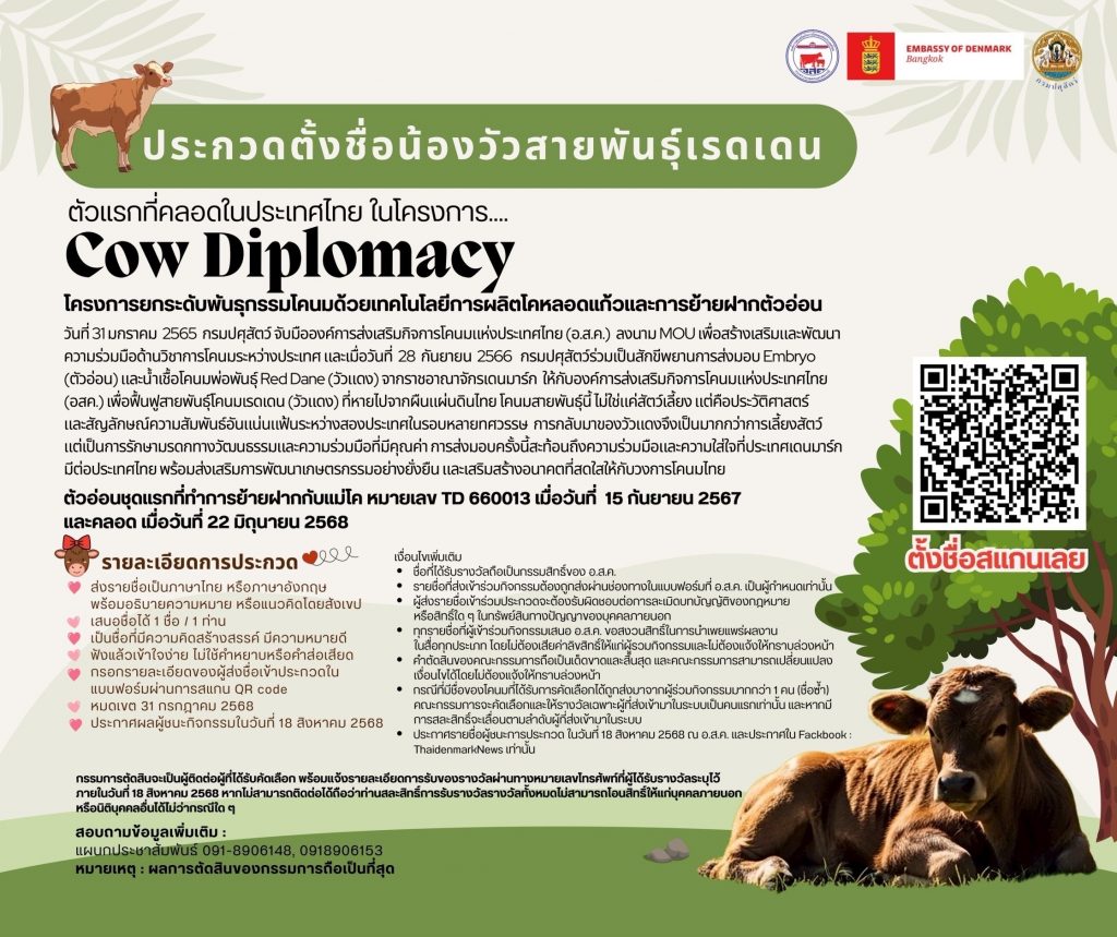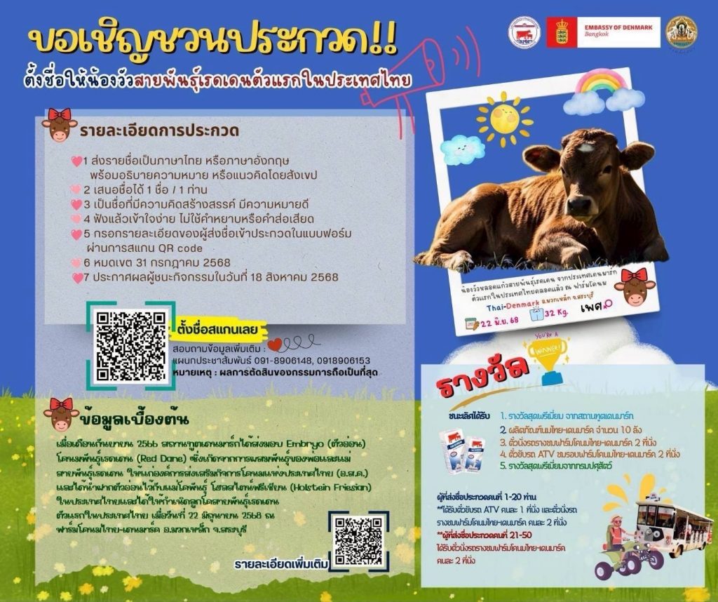 อ.ส.ค. เปิดประกวดตั้งชื่อลูกโคนมสายพันธุ์เรดเดน (Red Dane) ตัวแรกของไทย จากเทคโนโลยีการผลิตโคหลอดแก้วและการย้ายฝากตัวอ่อน ลุ้นรับของรางวัลสุดพิเศษจากไทย-เดนมาร์ค และสถานทูตเดนมาร์ก