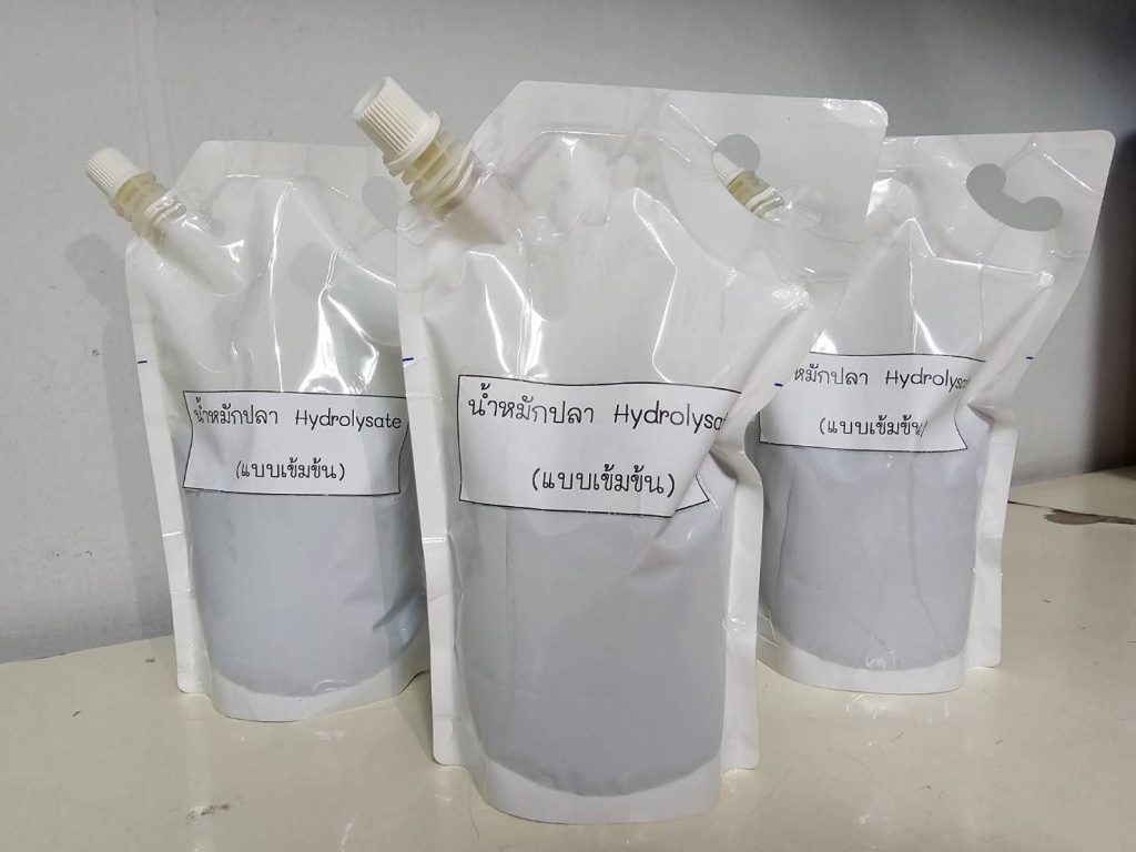 นางสาวลัดดาวัลย์ ครองพงษ์ ผู้อำนวยการกองวิจัยและพัฒนาอาหารสัตว์น้ำ กรมประมง กล่าวเพิ่มเติมในรายละเอียดว่า กองวิจัยและพัฒนาอาหารสัตว์น้ำ โดยศูนย์วิจัยและพัฒนาอาหารสัตว์น้ำชลบุรี ได้ดำเนินการศึกษาวิจัยและประยุกต์การแปรรูปเศษปลาเพื่อผลิตโปรตีนไฮโดรไลเสต มาตั้งแต่ปี 2559 เนื่องจากเล็งเห็นศักยภาพของเศษปลาเหลือทิ้งจากวัตถุดิบในกิจการประมงว่า สามารถพัฒนาให้เกิดประโยชน์ได้ จึงได้ทดลองผลิต โปรตีนไฮโดรไลเสต โดยเลือกใช้กระบวนการหมักด้วยจุลินทรีย์ (Microbial Fermentation) ที่เป็นการหมักเศษปลาด้วยเชื้อ Lactobacillus plantarum ที่เลี้ยงในน้ำสับปะรด ซึ่งมีราคาย่อมเยาและหาได้ง่าย โดยโปรตีนไฮโดรไลเสตจากเศษปลาที่ได้จะเป็นส่วนก้าง และที่ปั่นเป็นของเหลว จึงนำไปทำเป็นผงด้วยวิธี Spray Drying ได้ค่าโปรตีนถึงร้อยละ 50 ซึ่งเป็นแหล่งโปรตีนทางเลือกที่สามารถใช้เป็นวัตถุดิบในอาหารสัตว์น้ำที่ใช้ต้นทุนการผลิตต่ำ แต่ให้ผลผลิตโปรตีนไฮโดรไลเสตที่อุดมด้วยกรดอะมิโนในรูปแบบที่สัตว์น้ำสามารถดูดซึมได้ทันที เหมาะสำหรับการนำไปใช้เลี้ยงสัตว์น้ำวัยอ่อน
