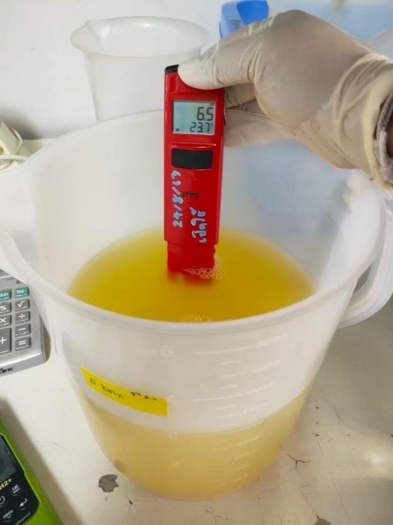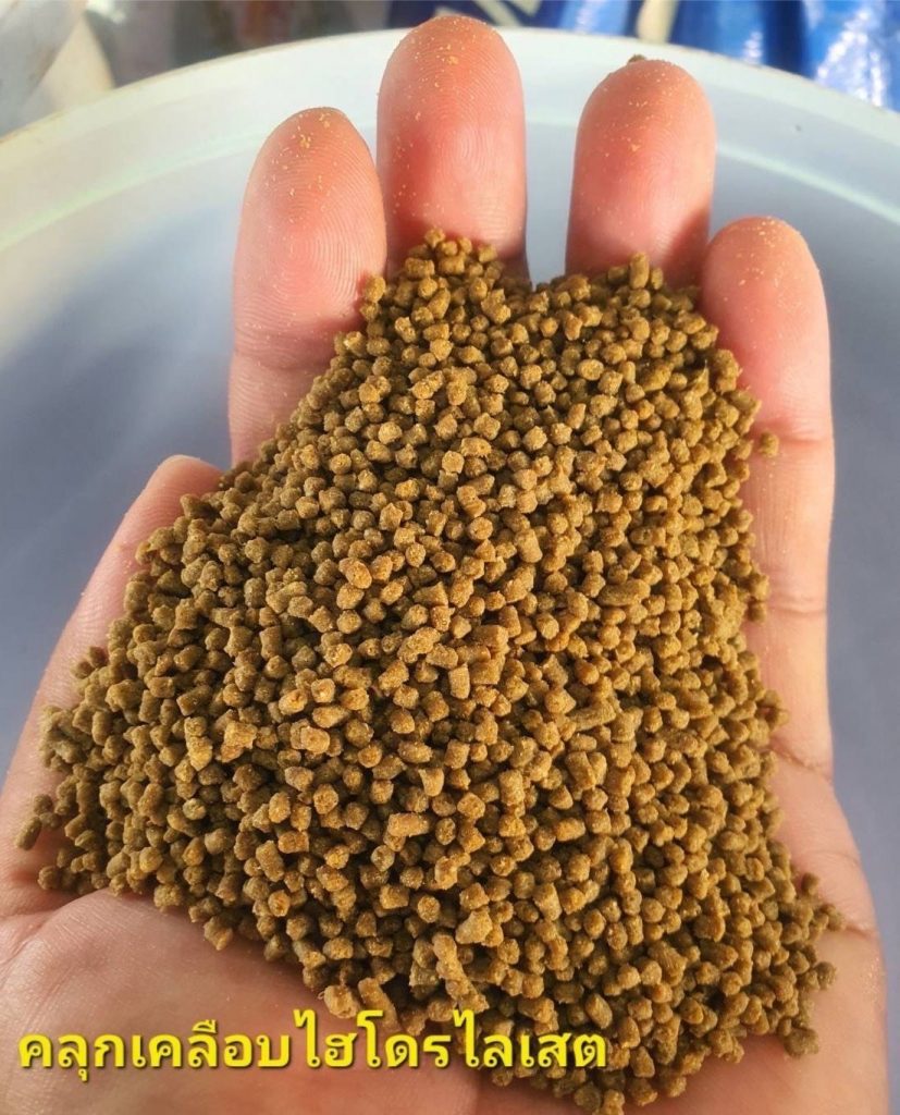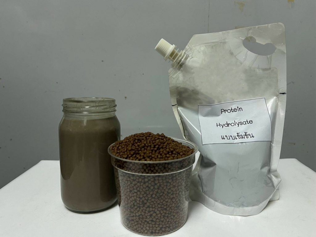 กระทั่งในปี 2567 ได้ขยายงานวิจัยดังกล่าวสู่เกษตรกรผู้เพาะเลี้ยงสัตว์น้ำ ตามแผนงานยุทธศาสตร์การเกษตรสร้างมูลค่า ภายใต้กิจกรรมส่งเสริมการใช้ประโยชน์จากวัสดุเหลือใช้ทางการประมง เพื่อให้เกษตรกรสามารถใช้ทรัพยากรที่มีอยู่ในท้องถิ่นให้เกิดประโยชน์สูงสุด แต่ยังพบอุปสรรคในการใช้งานจริง เนื่องจากการผลิตมีความยุ่งยากในการเตรียมหัวเชื้อจุลินทรีย์ ราคาสับปะรดบางพื้นที่ค่อนข้างสูง และยังมีข้อจำกัดในการใช้ผลิตภัณฑ์ในรูปแบบน้ำ ซึ่งไม่สามารถใช้แทนปลาป่นได้มากในสูตรอาหารสัตว์น้ำ ปัจจุบันทางศูนย์วิจัยและพัฒนาอาหารสัตว์น้ำชลบุรี จึงได้ดำเนินการปรับกระบวนการผลิตโปรตีนไฮโดรไลเสตให้เหมาะสมกับการใช้งานของเกษตรกรมากขึ้น โดยนำโปรตีนไฮโดรไลเสตในรูปแบบน้ำที่ผ่านการกรองแยกก้างและเกล็ดออกแล้วมากรองซ้ำอีกครั้ง เพื่อให้ได้เฉพาะส่วนของผลิตภัณฑ์ที่มีคุณค่าทางโภชนาการ ส่วนของเหลวที่ได้จะถูกนำไปผ่านกระบวนการทำแห้งแบบ Spray Drying เพื่อให้เป็นผงโปรตีนที่สามารถผสมในสูตรอาหารสัตว์ได้ง่ายและเก็บรักษาได้นาน พร้อมพัฒนารูปแบบ “โปรตีนไฮโดรไลเสตแบบเข้มข้น” สำหรับใช้คลุกเคลือบเม็ดอาหาร ทำหน้าที่เป็นสารดึงดูดกลิ่น (Feed attractant) และเพิ่มคุณค่าทางอาหาร ส่งผลให้สัตว์น้ำกินอาหารได้ดีขึ้น เจริญเติบโตเร็วขึ้น และมีอัตรารอดสูงขึ้น อีกทั้งโปรตีนไฮโดรไลเสตแบบเข้มข้นยังเหมาะสมอย่างยิ่งสำหรับใช้ในสัตว์น้ำวัยอ่อน ซึ่งมีระบบย่อยอาหารที่ยังไม่พัฒนาเต็มที่ โดยเฉพาะในลูกกุ้งหรือลูกปลาวัยอ่อน รวมถึงในกระบวนการผลิตยังสามารถปรับสูตรและแหล่งวัตถุดิบให้เหมาะกับพื้นที่หรือฤดูกาลได้ นอกจากนี้ ยังได้วางแนวทางการพัฒนาผลิตภัณฑ์เพื่อสนับสนุนเกษตรกร เช่น การผลิตกล้าเชื้อจุลินทรีย์แบบพร้อมใช้ การพัฒนาผงน้ำสับปะรดแห้งสำหรับการหมัก การศึกษาการใช้น้ำอ้อยเป็นแหล่งอาหารทดแทนน้ำสับปะรดในการเลี้ยงเชื้อจุลินทรีย์ เพื่อให้เกษตรกรสามารถเลือกใช้วัตถุดิบตามความพร้อมและศักยภาพของแต่ละพื้นที่ต่อไป