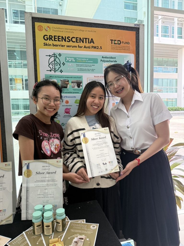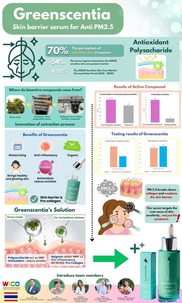 กรมประมง โดยกองวิจัยและพัฒนาการเพาะเลี้ยงสัตว์น้ำชายฝั่ง จึงร่วมกับ วิทยาลัยแพทยศาสตร์นานาชาติจุฬาภรณ์ มหาวิทยาลัยธรรมศาสตร์ ดำเนินโครงการ “Greenscentia: Skin Barrier Serum for Anti PM2.5” ในการวิจัยและพัฒนาต่อยอดสาหร่ายพวงองุ่นเป็นผลิตภัณฑ์เครื่องสำอางเชิงสุขภาพ หรือ เวชสำอาง ที่ผสมผสานคุณสมบัติในการดูแลและบำรุงผิวอย่างล้ำลึกเพื่อแก้ไขปัญหาผิวด้านต่าง ๆ โดยนำสาหร่ายมาสกัดสารออกฤทธิ์ทางชีวภาพ (Bioactive compounds) ด้วยวิธีการสกัดที่เพิ่มประสิทธิภาพการดึงสารออกฤทธิ์สูงกว่าวิธีทั่วไป และนำมาเป็นส่วนประกอบหลักในการผลิตเครื่องสำอาง จนได้ “ผลิตภัณฑ์ Greenscentia – เซรั่มสร้างเกราะป้องกันผิวจาก PM 2.5” ที่อุดมไปด้วย Polysaccharide ซึ่งทำหน้าที่เป็น Natural Moisturizing Factor รักษาความชุ่มชื้นและปกป้องผิวจากการสูญเสียน้ำ, Antioxidant สารต้านอนุมูลอิสระที่ช่วยลดริ้วรอย, Apigenin ช่วยลดการอักเสบของผิวหนัง รวมถึง กระตุ้นการสร้าง Collagen ที่เป็นส่วนประกอบสำคัญในผิวหนัง โดยผลิตภัณฑ์ Greenscentia มี Polysaccharide สูงถึง 2.74% ซึ่งมีส่วนช่วยในการต้านการอักเสบและการปกป้องผิวจากมลภาวะ และมีฤทธิ์ต้านอนุมูลอิสระ (Antioxidant activities) ที่มีประสิทธิภาพสูงถึง 41.25% จากผลการทดสอบประสิทธิภาพของผลิตภัณฑ์หลังใช้ 15 นาที พบว่าสามารถเพิ่มระดับความชุ่มชื้นให้แก่ผิวอย่างเห็นได้ชัด โดยไม่ทำให้ผิวมัน (Skin oiliness) เพิ่มขึ้น ซึ่งเหมาะสำหรับผู้ที่มีผิวแพ้ง่ายและบอบบาง เนื่องจากมีส่วนผสมจากธรรมชาติและปราศจากการปนเปื้อนของสารเคมี จนล่าสุดเมื่อวันที่ 17-19 กรกฎาคม 2568 ที่ผ่านมา ผลงานวิจัยดังกล่าวได้รับรางวัล Silver Award จากงาน World Invention Creativity Olympic & Conference (WICO) ซึ่งเป็นเวทีสำคัญระดับนานาชาติที่เปิดโอกาสให้นักวิจัยจากทั่วโลกนำเสนอผลงานวิจัยและนวัตกรรม รวมถึง แลกเปลี่ยนข้อคิดเห็นและสร้างเครือข่ายความร่วมมือ เพื่อส่งเสริมให้เกิดการพัฒนาเทคโนโลยีและนวัตกรรมใหม่ จัดขึ้นโดย Korea University Invention Association (KUIA) และ World Invention Intellectual Property Association (WIIPA) สาธารณรัฐเกาหลี