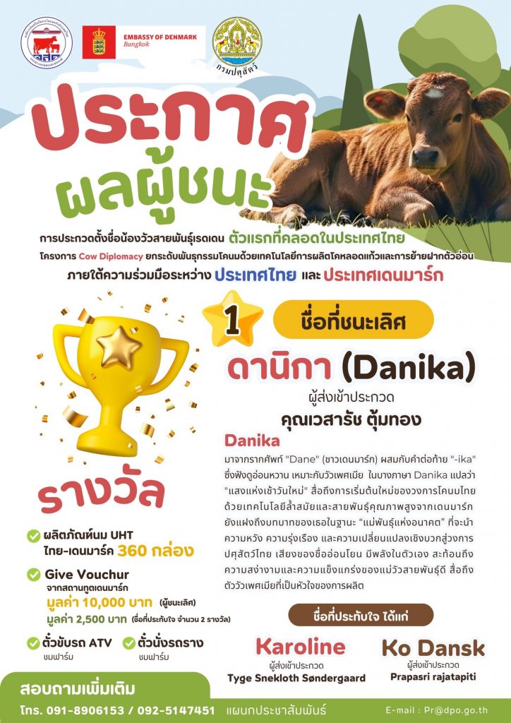 กิจกรรมประกวดตั้งชื่อลูกโคนมเรดเดน (Red Den) ตัวแรกของไทยได้รับความสนใจจากทั่วประเทศ โดยคณะกรรมการจาก อ.ส.ค. กรมปศุสัตว์ และสถานเอกอัครราชทูตเดนมาร์กได้คัดเลือกชื่อ “ดานิกา (Danika)” ซึ่งหมายถึงแสงแห่งเช้าวันใหม่ สื่อถึงการเริ่มต้นใหม่ของวงการโคนมไทย ผู้ส่งเข้าประกวดคือคุณเวสารัช ตุ้มทอง ได้รับรางวัล ผลิตภัณฑ์นม UHT ไทย-เดนมาร์ค 360 กล่อง, Gift Vocher มูลค่า 10,000.-บาท, ตั๋วนั่งรถรางชมฟาร์ม และบัตรขับ ATV ชมฟาร์ม