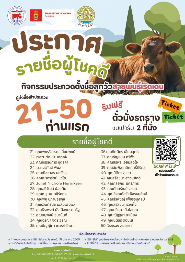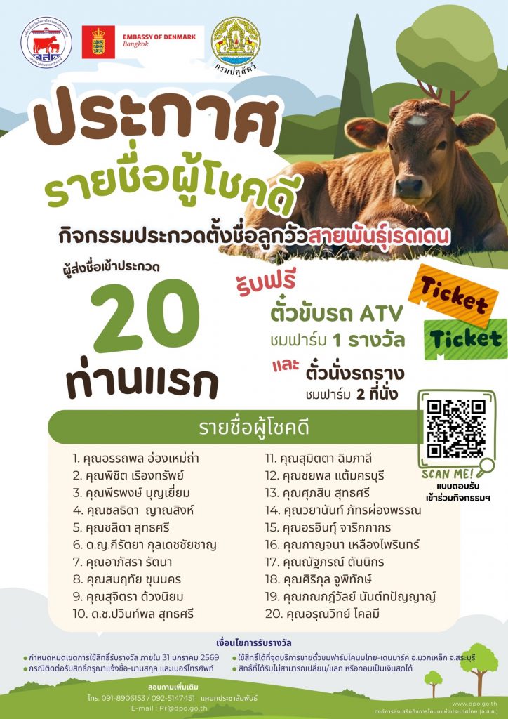 เมื่อวันที่ 20 สิงหาคม 2568 องค์การส่งเสริมกิจการโคนมแห่งประเทศไทย (อ.ส.ค.) จัดพิธีมอบรางวัลการประกวดตั้งชื่อลูกโคนมสายพันธุ์เรดเดนตัวแรกที่เกิดในประเทศไทย ภายใต้โครงการ Red Cow Diplomacy ณ ลานการแสดงกิจกรรมคาวบอย ฝ่ายท่องเที่ยวเชิงเกษตร อ.ส.ค. อำเภอมวกเหล็ก จังหวัดสระบุรี