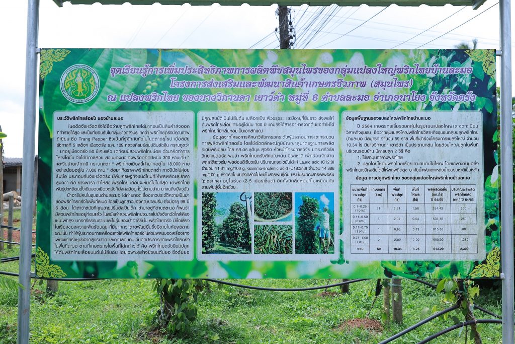 นายครองศักดิ์ สงรักษา รองอธิบดีกรมส่งเสริมการเกษตร กล่าวว่า กรมส่งเสริมการเกษตรเล็งเห็นถึงศักยภาพของพื้นที่ จึงได้มีการรวมกลุ่มเกษตรกรจัดตั้งเป็นวิสาหกิจชุมชน และยกระดับสู่การเป็นแปลงใหญ่พริกไทย ในปี 2565 ซึ่งประกอบไปด้วยเกษตรกร จำนวน 30 ราย พื้นที่ปลูกประมาณ 12 ไร่ โดยมีเป้าหมายในการส่งเสริมให้กลุ่มเกษตรกรเพิ่มขีดความสามารถใน 5 ด้าน คือ 1. ลดต้นทุนการผลิต 2. เพิ่มประสิทธิภาพการผลิต 3. พัฒนาคุณภาพ 4. เพิ่มช่องทางการตลาด และ 5. การบริหารจัดการ