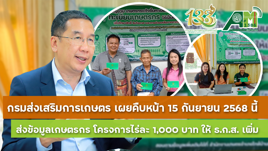 กรมส่งเสริมการเกษตร เผยคืบหน้า 15 กันยายน 2568 นี้ ส่งข้อมูลเกษตรกร โครงการไร่ละ 1,000 บาท ให้ ธ.ก.ส. เพิ่ม