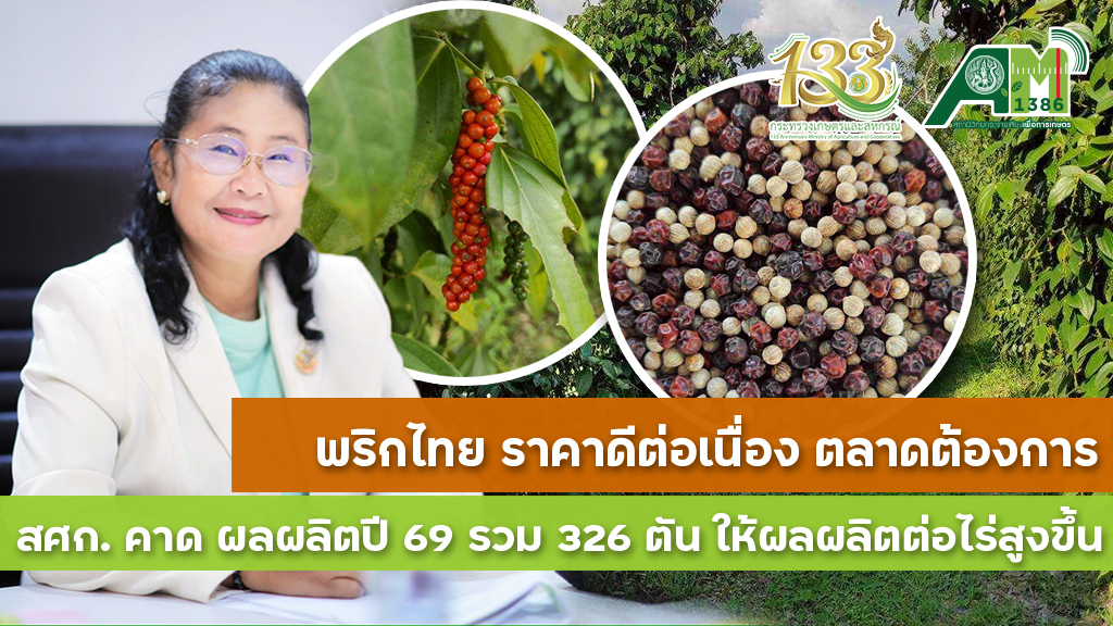 พริกไทย ราคาดีต่อเนื่อง ตลาดต้องการ สศก. คาด ผลผลิตปี 69 รวม 326 ตัน ให้ผลผลิตต่อไร่สูงขึ้น