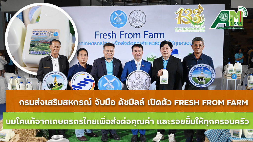 กรมส่งเสริมสหกรณ์ จับมือ ดัชมิลล์ เปิดตัว “FRESH FROM FARM นมโคแท้จากเกษตรกรไทยเพื่อส่งต่อคุณค่าและรอยยิ้มให้ทุกครอบครัว” ส่งต่อนมสดใหม่ ใส่ใจ และมีที่มาให้ผู้บริโภคเข้าถึงได้ในราคายุติธรรม พร้อมยกระดับรายได้และศักยภาพเกษตรกร ผ่านความร่วมมือเชิงระบบตั้งแต่การจัดการฟาร์ม สุขภาพโคนม การบริหารต้นทุน การรวบรวมน้ำนมดิบ จนถึงการผลิต ช่วยยกระดับสุขภาพของครอบครัวไทยเพื่อให้ทุกครอบครัวเข้าถึงนมที่ดี มีคุณภาพอย่างทั่วถึง