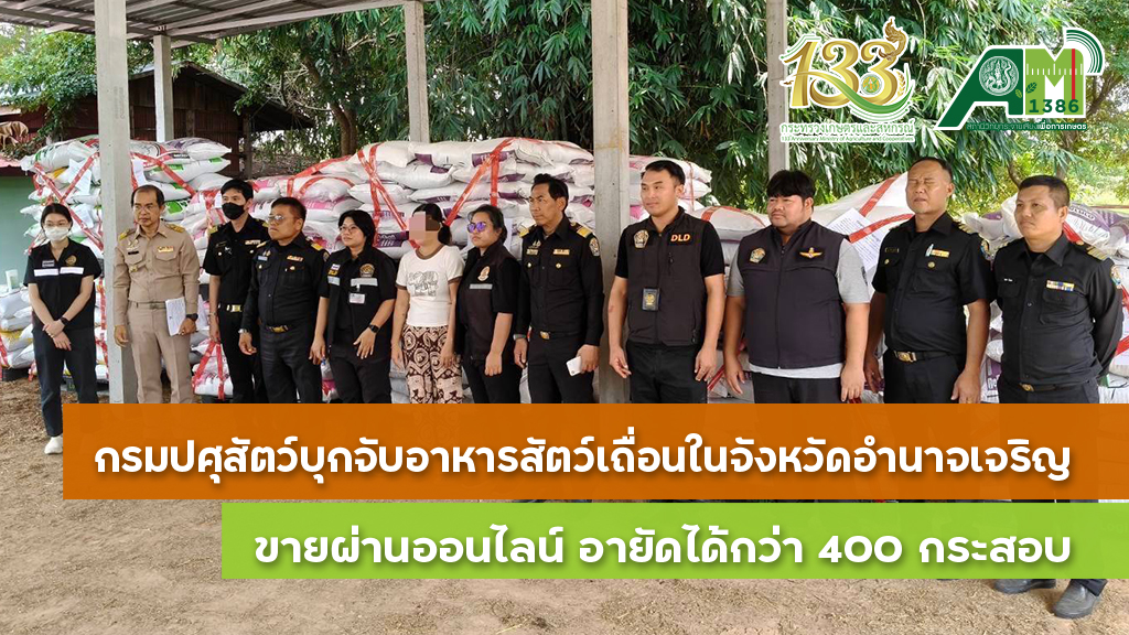 กรมปศุสัตว์บุกจับอาหารสัตว์เถื่อนในจังหวัดอำนาจเจริญ ขายผ่านออนไลน์ อายัดได้กว่า 400 กระสอบ