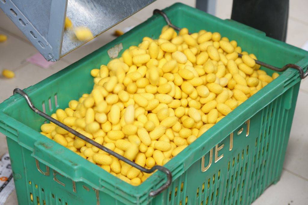 ส่วนชนิดรังไหม (รังเสีย) ที่ขายได้นั้น ประกอบด้วย รังแฝด 100 บาท/กิโลกรัม รังเสีย 90 บาท/กิโลกรัม รังบางและเน่า 20 บาท/กิโลกรัม และรังดีหลังจ่อ 120 บาท/กิโลกรัม มีราคาปุยไหม 5 บาท/กิโลกรัม เฉลี่ยการกินใบหม่อน/แผ่น 400-450 กิโลกรัม/แผ่น ผลผลิตหม่อน/ไร่ 2,500-3,000 กิโลกรัม/ไร่/ปี เลี้ยงไหมได้ปีละ 8-10 รุ่น ตามการแบ่งแปลงหม่อนและการจัดการแปลงหม่อน