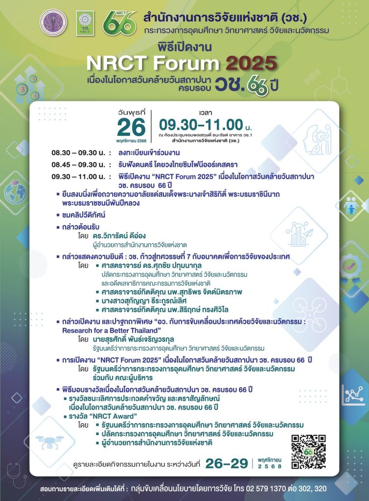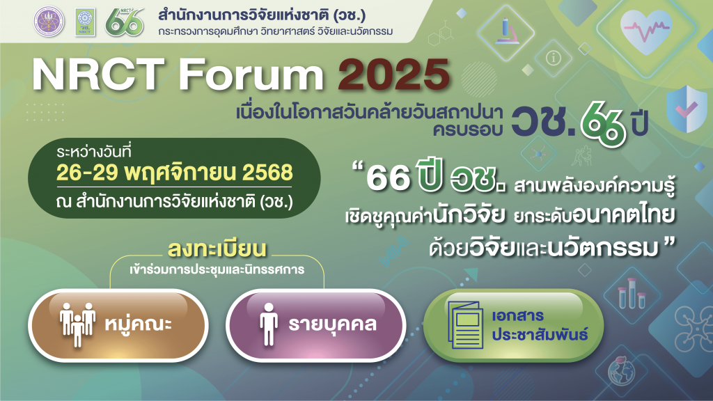 ขอประชาสัมพันธ์ เชิญท่านที่สนใจเข้าร่วมงาน NRCT Forum 2025 เนื่องในโอกาสวันคล้ายวันสถาปนาครบรอบ วช. 66 ปี