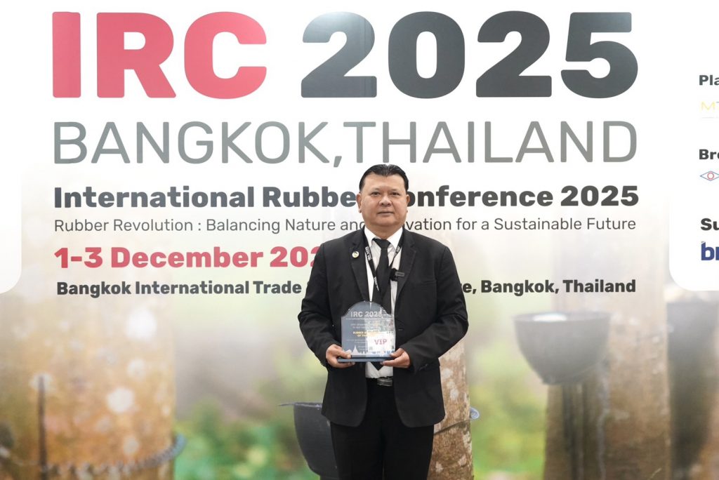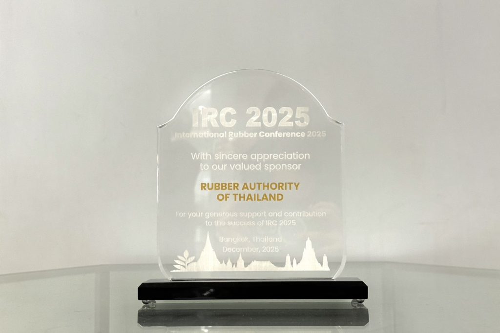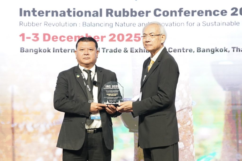วันนี้ (1 ธ.ค. 68) ณ ศูนย์นิทรรศการและการประชุมไบเทค (BITEC) — การยางแห่งประเทศไทย (กยท.) หรือ RAOT โดย นายดิษฐเดช วัฒนาพร รองผู้ว่าการด้านปฏิบัติการ เข้าร่วมงาน International Rubber Conference 2025 (IRC 2025) พร้อมเป็นผู้แทนในฐานะหน่วยงานภาครัฐที่ดูแลในภาคอุตสาหกรรมยางไทยกล่าวต้อนรับผู้ร่วมงาน และรับมอบโล่เกียรติคุณจาก ผศ.ดร.กฤษฎา สุชีวะ ประธานคณะกรรมการจัดการประชุม IRC 2025 สมาคมโพลิเมอร์แห่งประเทศไทย ซึ่งงานครั้งนี้จัดขึ้นภายใต้ธีม “Rubber Revolution: Balancing Nature and Innovation for a Sustainable Future” ตอกย้ำบทบาทสำคัญของไทยในภาคอุตสาหกรรมยาง พร้อมขับเคลื่อนการพัฒนาที่ผสานธรรมชาติและนวัตกรรมสู่ความยั่งยืน