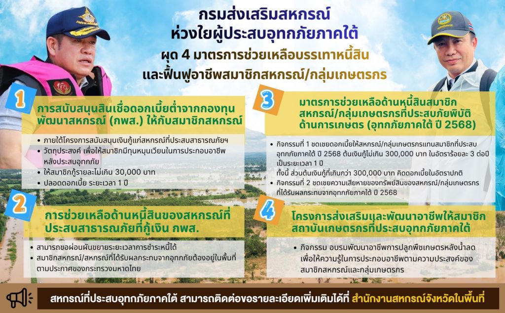 “ขณะนี้เจ้าหน้าที่ของสำนักงานสหกรณ์จังหวัดที่อยู่ในพื้นที่ภาคใต้ร่วมกันเปิดโรงครัวและลงพื้นที่ไปแจกจ่ายอาหารและถุงยังชีพ รวมถึงบรรเทาความเดือดร้อนให้กับสมาชิกสหกรณ์/กลุ่มเกษตรกรและประชาชนในพื้นที่อย่างต่อเนื่อง รวมถึงประสานงานกับหน่วยงานของกระทรวงเกษตรและสหกรณ์ในแต่ละจังหวัด จัดกิจกรรม Big Cleaning Day เพื่อช่วยกันทำความสะอาดพื้นที่น้ำท่วมหลังสถานการณ์คลี่คลาย ซึ่งสมาชิกสหกรณ์/กลุ่มเกษตรกร ที่ได้รับความเดือดร้อนจากสถานการณ์อุทกภัยน้ำท่วมภาคใต้ในครั้งนี้ สามารถติดต่อขอรับความช่วยเหลือได้ที่สำนักงานสหกรณ์จังหวัดทุกแห่ง เพื่อทางเจ้าหน้าที่จะได้เร่งดำเนินการช่วยเหลือและฟื้นฟูอาชีพหลังน้ำลดต่อไป” อธิบดีกรมส่งเสริมสหกรณ์ กล่าว